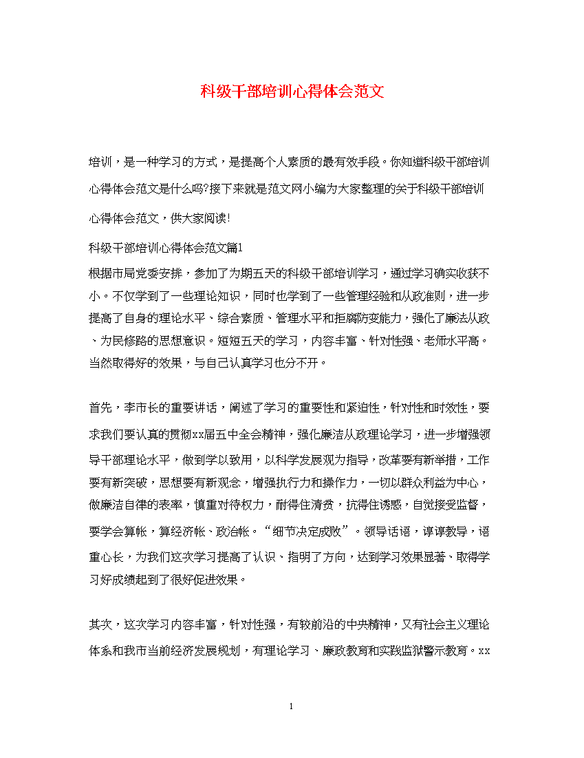 此资料由网络收集而来,如有侵权请告知上传者立即删除。资料共分享,我们负责传递知识。科级干部培训心得体会范文培训,是一种学习的方式,是提高个人素质的最有效手段。你知道科级干部培训心得体会范文是什么吗?接下来就是范文网小编为大家整理的关于科级干部培训心得体会范文,供大家阅读!科级干部培训心得体会范文篇1根据市局党委安排,参加了为期五天的科级干部培训学习,通过学习确实收获不小。不仅学到了一些理论知识,同时也学到了一些管理经验和从政准则,进一步提高了自身的理论水平、综合素质、管理水平