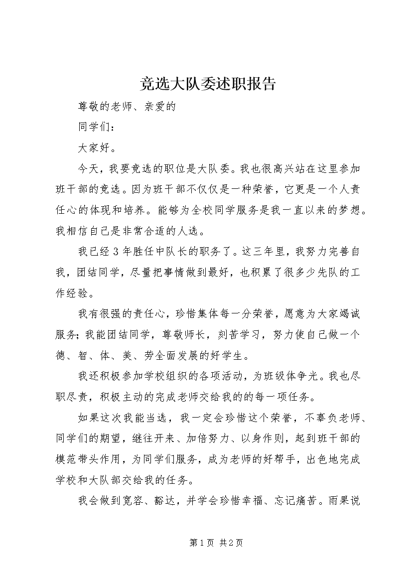竞选大队委述职报告尊敬的老师、亲爱的同学们:大家好。今天我要竞选的职位是大队委。我也很高兴站在这里参加班干部的竞选。因为班干部不仅仅是一种荣誉它更是一个人责任心的体现和培养。能够为全校同学服务是我一直以来的梦想。我相信自己是非常合适的人选。我已经3年胜任中队长的职务了。这三年里我努力完善自我团结同学尽量把事情做到最好也积累了很多少先队的工作经验。我有很强的责任心珍惜集体每一分荣誉愿意为大家竭诚服务;我能团结同学尊敬师长刻苦学习努力使自
