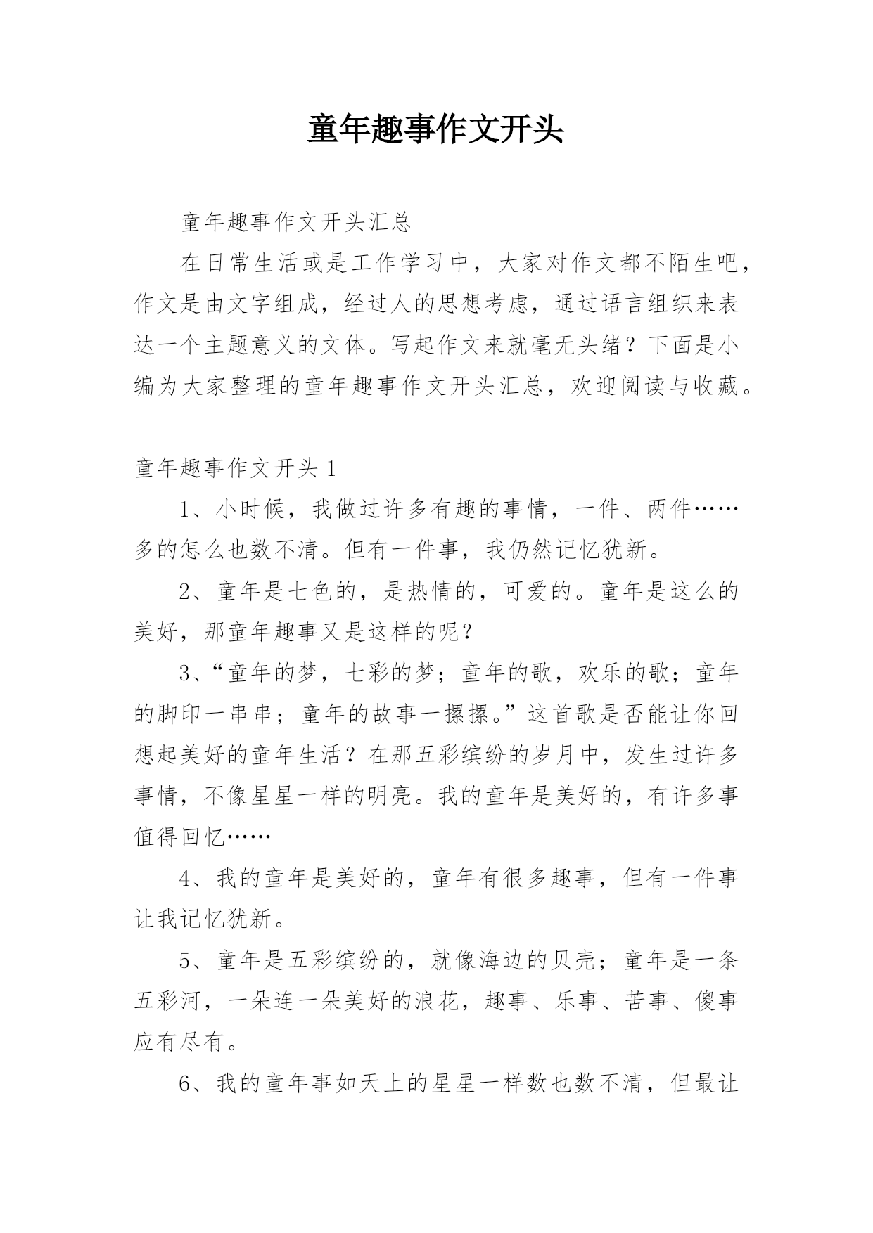 童年趣事作文开头童年趣事作文开头汇总在日常生活或是工作学习中,大家对作文都不陌生吧,作文是由文字组成,经过人的思想考虑,通过语言组织来表达一个主题意义的文体。写起作文来就毫无头绪?下面是小编为大家整理的童年趣事作文开头汇总,欢迎阅读与收藏。童年趣事作文开头11、小时候,我做过许多有趣的事情,一件、两件……多的怎么也数不清。但有一件事,我仍然记忆犹新。2、童年是七色的,是热情的,可爱的。童年是这么的美好,那童年趣事又是这样的呢?3、“童年的梦,七彩的梦;童年的歌,欢乐的歌;童年的脚印一串串;童年的故事一摞摞
