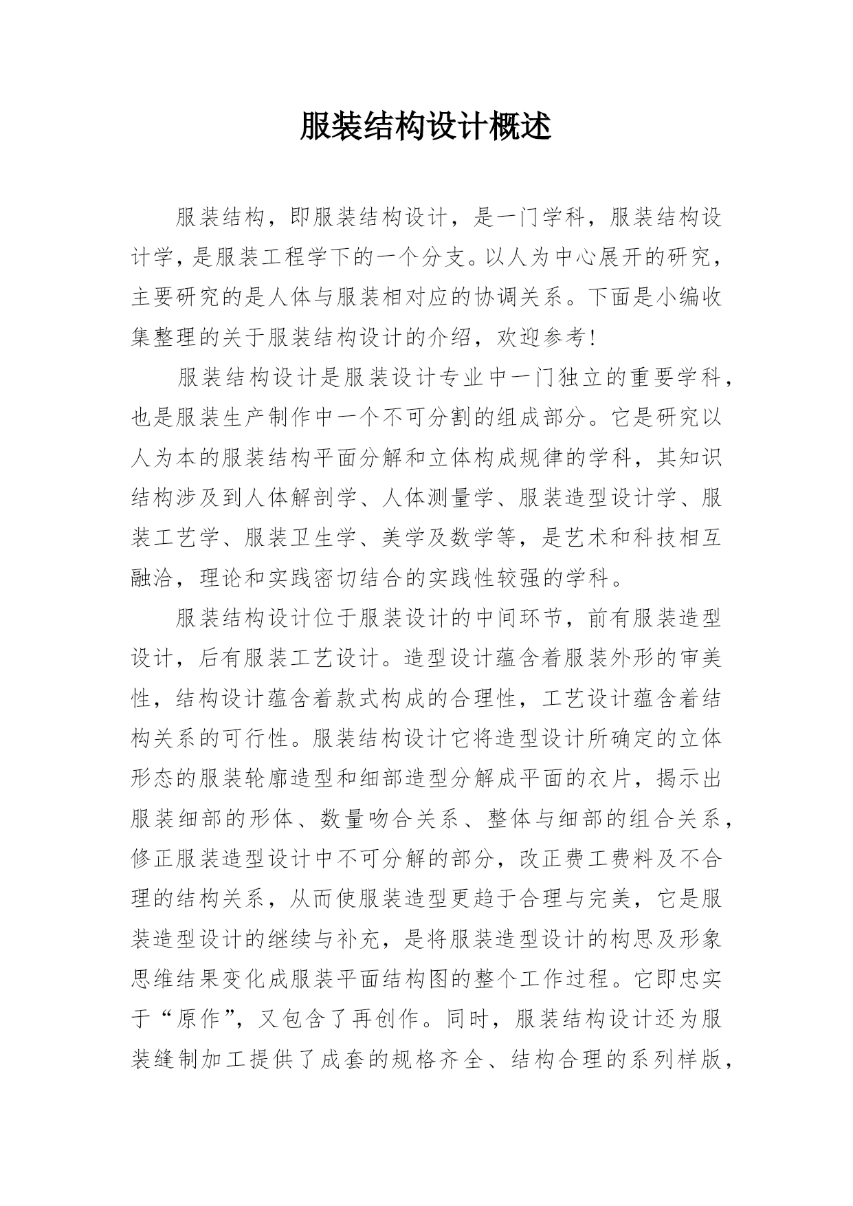 服装结构设计概述服装结构设计概述服装结构,即服装结构设计,是一门学科,服装结构设计学,是服装工程学下的一个分支。以人为中心展开的研究,主要研究的是人体与服装相对应的协调关系。下面是小编收集整理的关于服装结构设计的介绍,欢迎参考!服装结构设计是服装设计专业中一门独立的重要学科,也是服装生产制作中一个不可分割的组成部分。它是研究以人为本的服装结构平面分解和立体构成规律的学科,其知识结构涉及到人体解剖学、人体测量学、服装造型设计学、服装工艺学、服装卫生学、美学及数学等,是艺术和科技相互融洽,理论和实践密切结合的