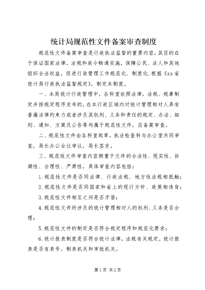 第PAGE\*Arabic\*MERGEFORMAT2页共NUMPAGES\*MERGEFORMAT2页统计局规范性文件备案审查制度规范性文件备案审查是行政执法监督的重要内容,其目的在于保证国家法律,法规和政令畅通实施,保障公民、法人和其他组织合法权益,促进行政管理工作规范化、制度化.根据《xx省统计局行政执法监督规定》,制定本制度。一、本局统计行政管理中,各科室依照法律,法规、规章制定并按规定程序发布的,在本行政区域内对统计管理相对人具有普遍法律约束力或者涉及其权利、义务和责任的规定、办法、