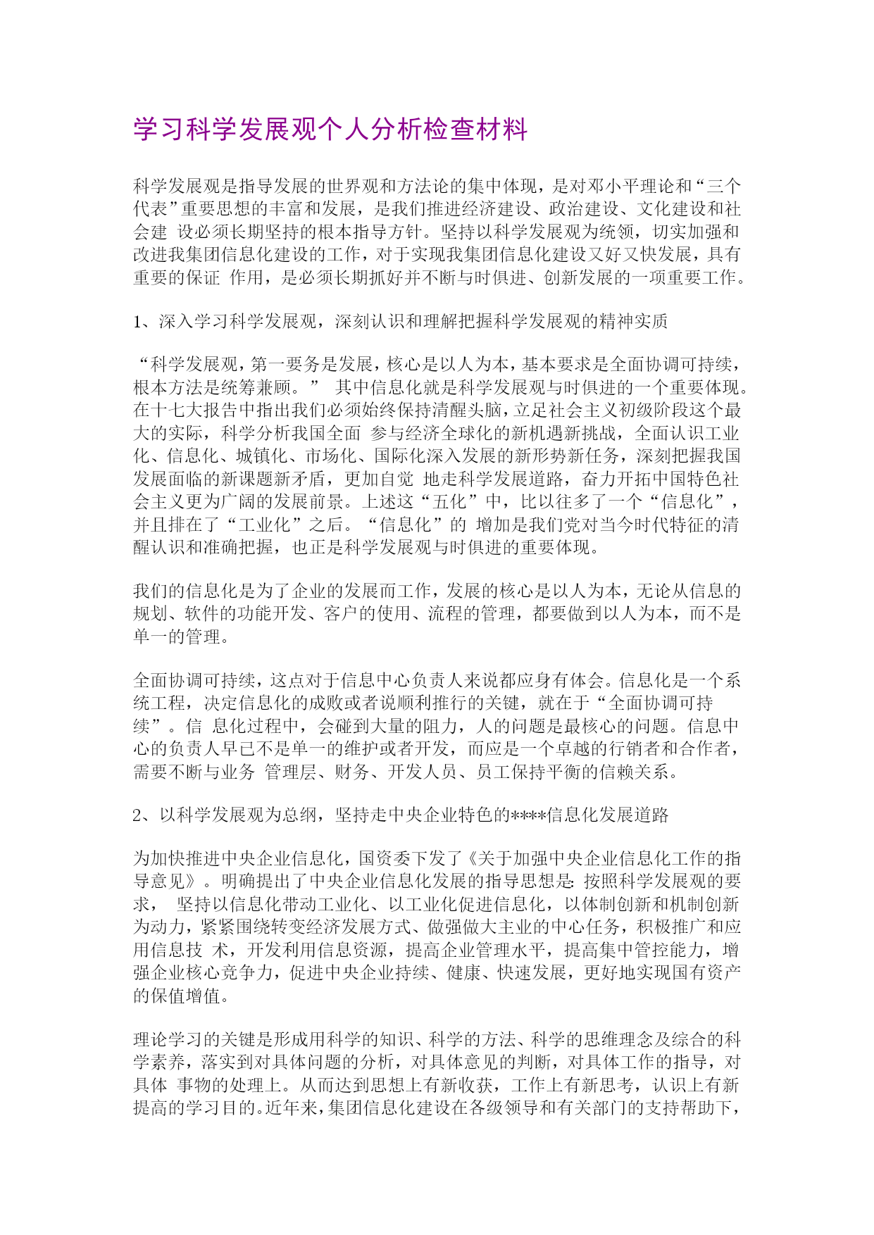学习科学发展观个人分析检查材料科学发展观是指导发展的世界观和方法论的集中体现,是对邓小平理论和“三个代表”重要思想的丰富和发展,是我们推进经济建设、政治建设、文化建设和社会建设必须长期坚持的根本指导方针。坚持以科学发展观为统领,切实加强和改进我集团信息化建设的工作,对于实现我集团信息化建设又好又快发展,具有重要的保证作用,是必须长期抓好并不断与时俱进、创新发展的一项重要工作。1、深入学习科学发展观,深刻认识和理解把握科学发展观的精神实质“科学发展观,第一要务是发展,核心是以人为本,基本要求是全面协调可持续