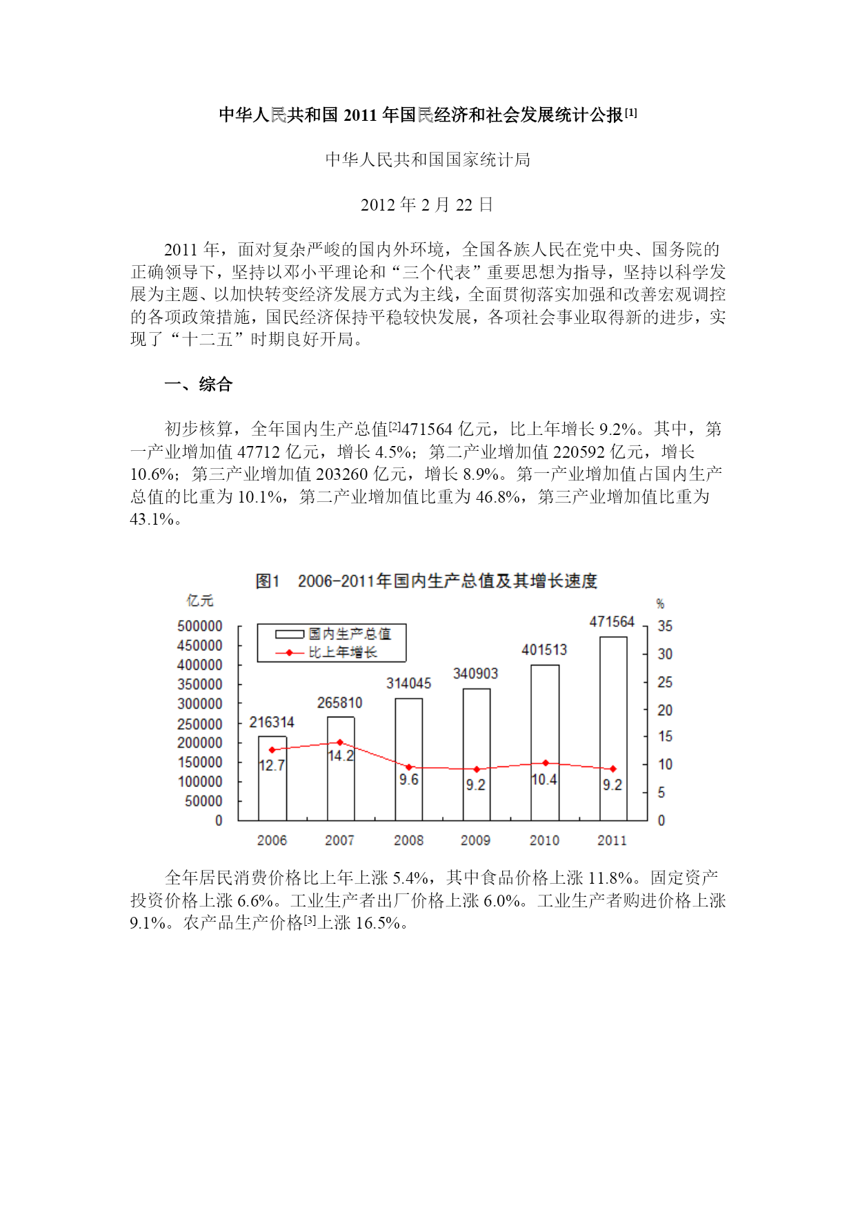 中华人民共和国2011年国民经济和社会发展统计公报[1]中华人民共和国国家统计局2012年2月22日2011年,面对复杂严峻的国内外环境,全国各族人民在党中央、国务院的正确领导下,坚持以邓小平理论和“三个代表”重要思想为指导,坚持以科学发展为主题、以加快转变经济发展方式为主线,全面贯彻落实加强和改善宏观调控的各项政策措施,国民经济保持平稳较快发展,各项社会事业取得新的进步,实现了“十二五”时期良好开局。一、综合初步核算,全年国内生产总值[2]471564亿元,比上年增长9.2%。其中,第一产业增加值477