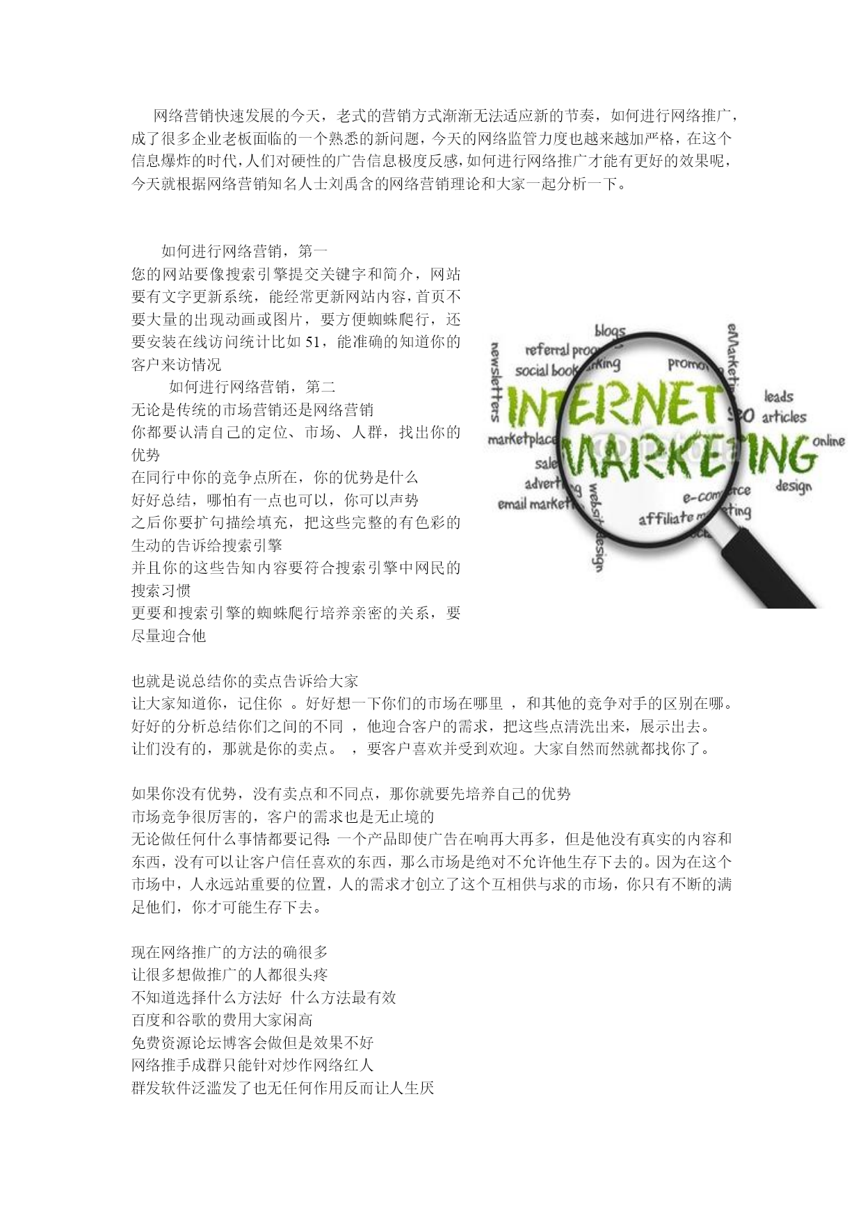 网络营销快速发展的今天,老式的营销方式渐渐无法适应新的节奏,如何进行网络推广,成了很多企业老板面临的一个熟悉的新问题,今天的网络监管力度也越来越加严格,在这个信息爆炸的时代,人们对硬性的广告信息极度反感,如何进行网络推广才能有更好的效果呢,今天就根据网络营销知名人士刘禹含的网络营销理论和大家一起分析一下。如何进行网络营销,第一您的网站要像搜索引擎提交关键字和简介,网站要有文字更新系统,能经常更新网站内容,首页不要大量的出现动画或图片,要方便蜘蛛爬行,还要安装在线访问统计比如51,能准确的知道你的客户来访情