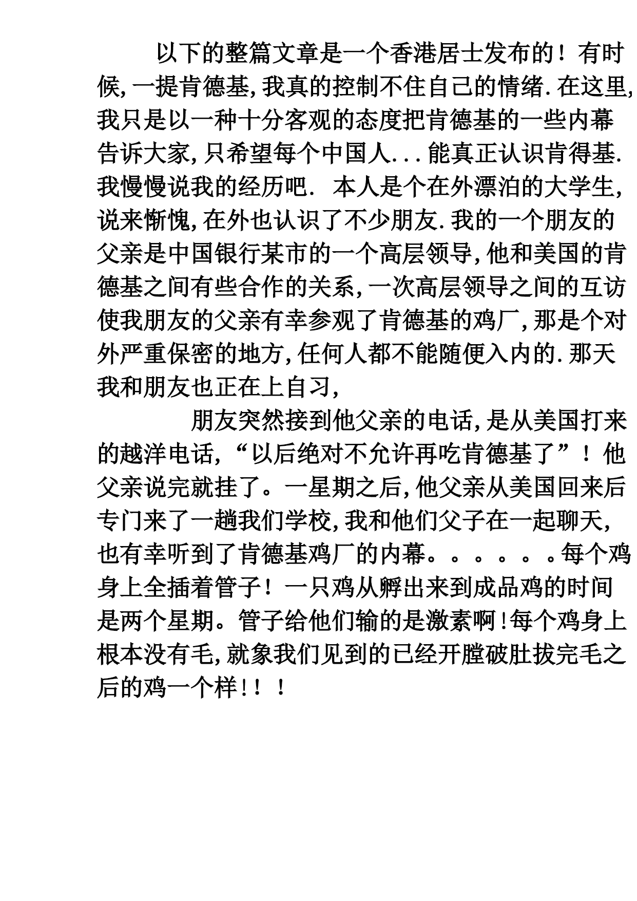 以下的整篇文章是一个香港居士发布的!有时候,一提肯德基,我真的控制不住自己的情绪.在这里,我只是以一种十分客观的态度把肯德基的一些内幕告诉大家,只希望每个中国人...能真正认识肯得基.我慢慢说我的经历吧.本人是个在外漂泊的大学生,说来惭愧,在外也认识了不少朋友.我的一个朋友的父亲是中国银行某市的一个高层领导,他和美国的肯德基之间有些合作的关系,一次高层领导之间的互访使我朋友的父亲有幸参观了肯德基的鸡厂,那是个对外严重保密的地方,任何人都不能随便入内的.那天我和朋友也正在上自习,朋友突然接到他父亲的电话,是