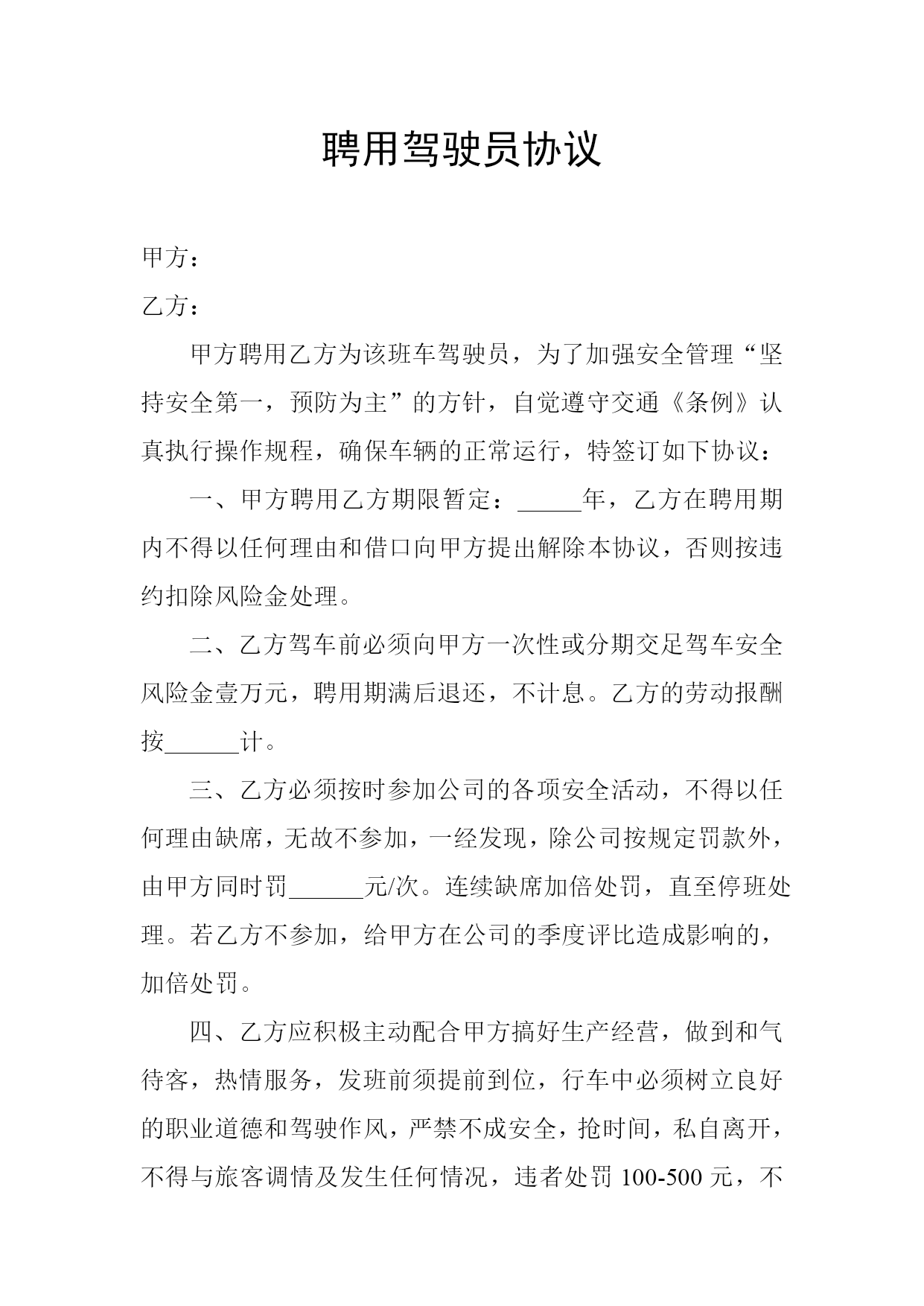 聘用驾驶员协议甲方:乙方:甲方聘用乙方为该班车驾驶员,为了加强安全管理“坚持安全第一,预防为主”的方针,自觉遵守交通《条例》认真执行操作规程,确保车辆的正常运行,特签订如下协议:一、甲方聘用乙方期限暂定:年,乙方在聘用期内不得以任何理由和借口向甲方提出解除本协议,否则按违约扣除风险金处理。二、乙方驾车前必须向甲方一次性或分期交足驾车安全风险金壹万元,聘用期满后退还,不计息。乙方的劳动报酬按计。三、乙方必须按时参加公司的各项安全活动,不得以任何理由缺席,无故不参加,一经发现,除公司按规定罚款外,由甲方同时罚