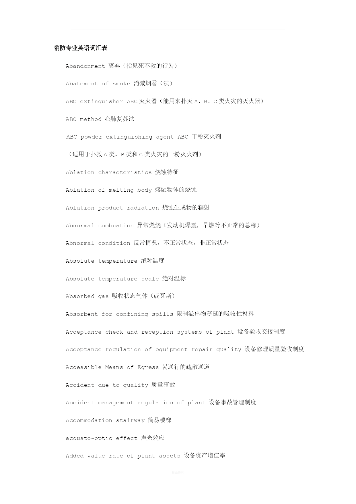 ______________________________________________________________________________________________________________精品资料消防专业英语词汇表Abandonment离弃(指见死不救的行为)Abatementofsmoke消减烟雾(法)ABCextinguisherABC灭火器(能用来扑灭A、B、C类火灾的灭火器)ABCmethod心肺复苏法ABCpowderextinguishingagentABC干粉