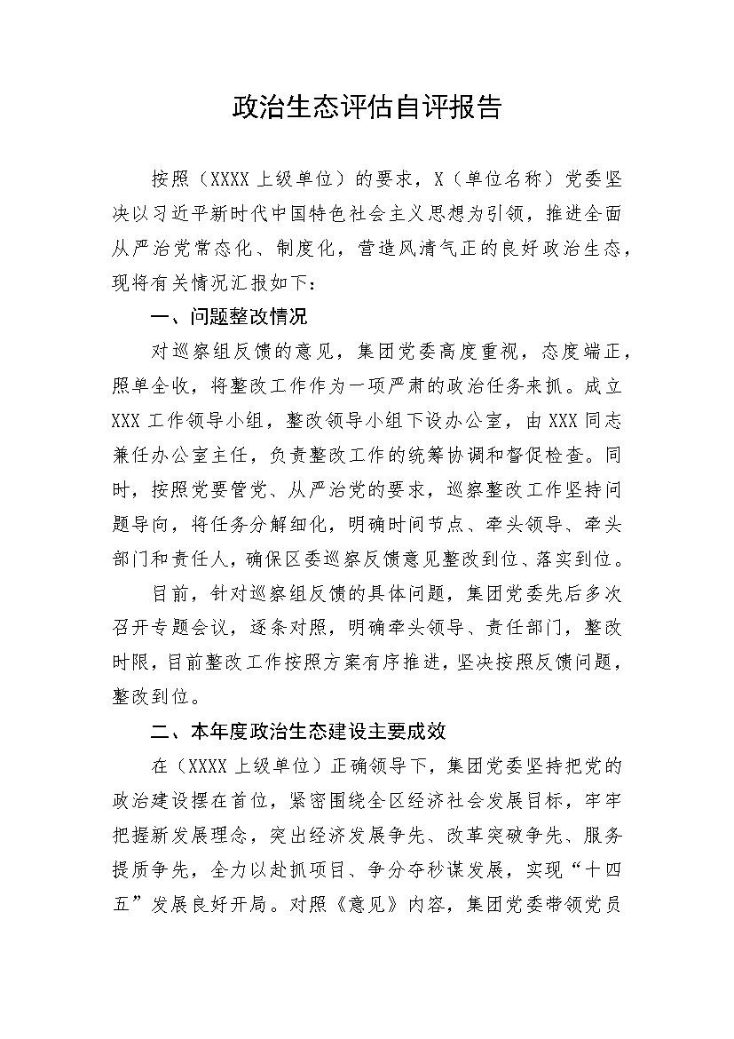 政治生态评估自评报告按照(XXXX上级单位)的要求X(单位名称)党委坚决以习近平新时代中国特色社会主义思想为引领推进全面从严治党常态化、制度化营造风清气正的良好政治生态现将有关情况汇报如下:一、问题整改情况对巡察组反馈的意见集团党委高度重视态度端正照单全收将整改工作作为一项严肃的政治任务来抓。成立XXX工作领导小组整改领导小组下设办公室由XXX同志兼任办公室主任负责整改工作的统筹协调和督促检查。同时按照党要管党、从严治党的要求巡察整改工作坚持问题导向将任务分解细化明确时间节点、牵头领导、牵头部门和责