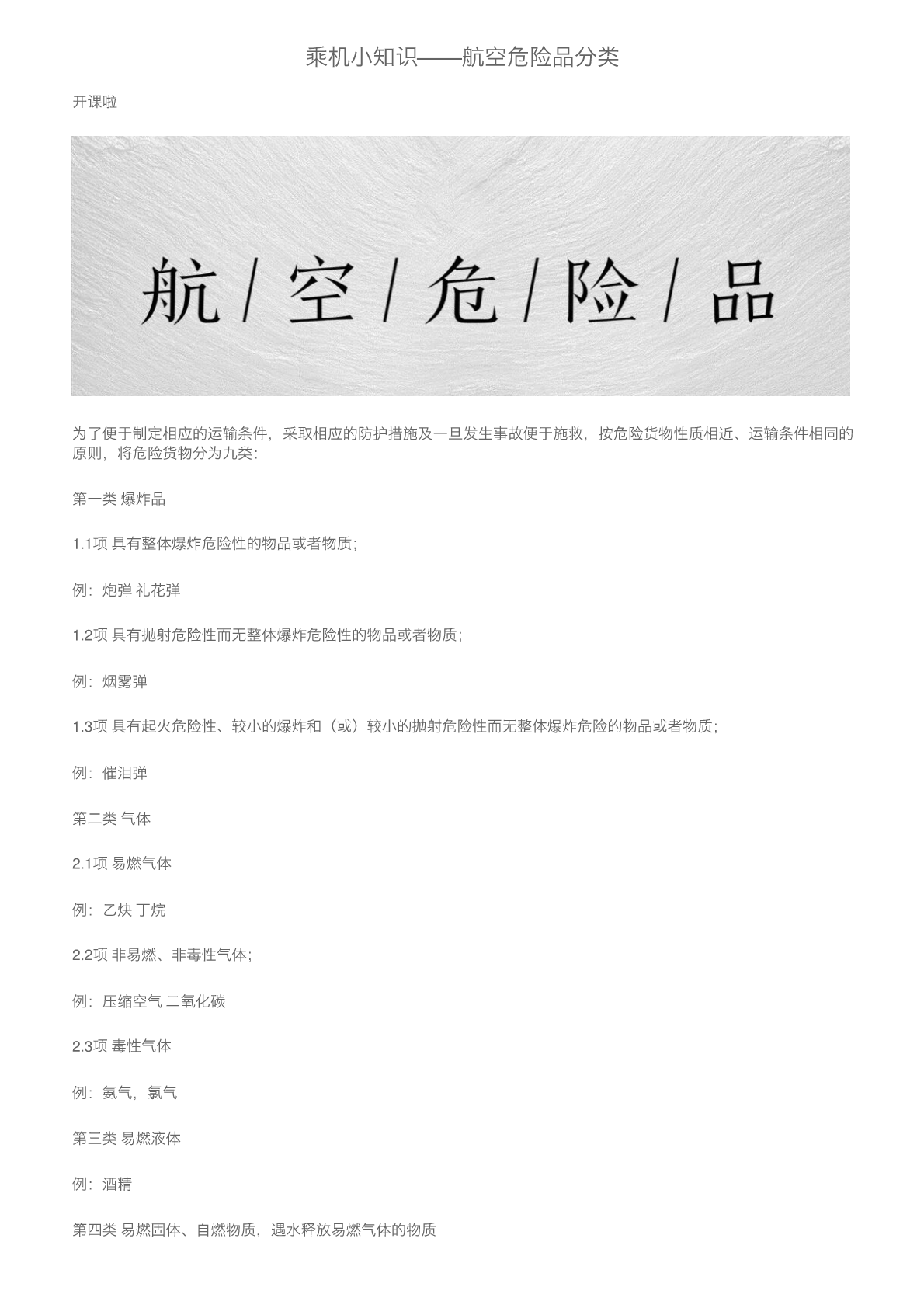 乘机⼩知识——航空危险品分类开课啦为了便于制定相应的运输条件,采取相应的防护措施及⼀旦发⽣事故便于施救,按危险货物性质相近、运输条件相同的原则,将危险货物分为九类:第⼀类爆炸品1.1项具有整体爆炸危险性的物品或者物质;例:炮弹礼花弹1.2项具有抛射危险性⽽⽆整体爆炸危险性的物品或者物质;例:烟雾弹1.3项具有起⽕危险性、较⼩的爆炸和(或)较⼩的抛射危险性⽽⽆整体爆炸危险的物品或者物质;例:催泪弹第⼆类⽓体2.1项易燃⽓体例:⼄炔丁烷2.2项⾮易燃、⾮毒性⽓体;例:压缩空⽓⼆氧化碳2.3项毒性⽓体例:氨⽓,