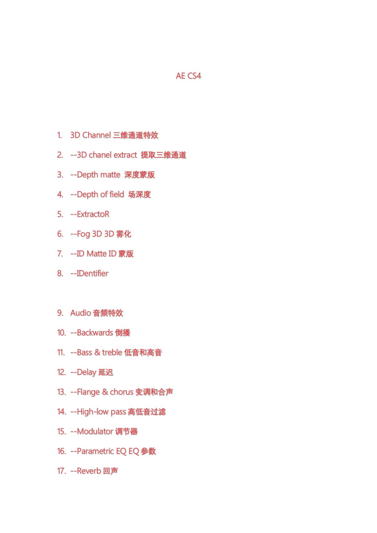 AECS43DChannel三维通道特效--3Dchanelextract提取三维通道--Depthmatte深度蒙版--Depthoffield场深度--ExtractoR--Fog3D3D雾化--IDMatteID蒙版--IDentifierAudio音频特效--Backwards倒播--Bass&treble低音和高音--Delay延迟--Flange&chorus变调和合声--High-lowpass高低音过滤--Modulator调节器--ParametricEQEQ参数--Reverb回声--