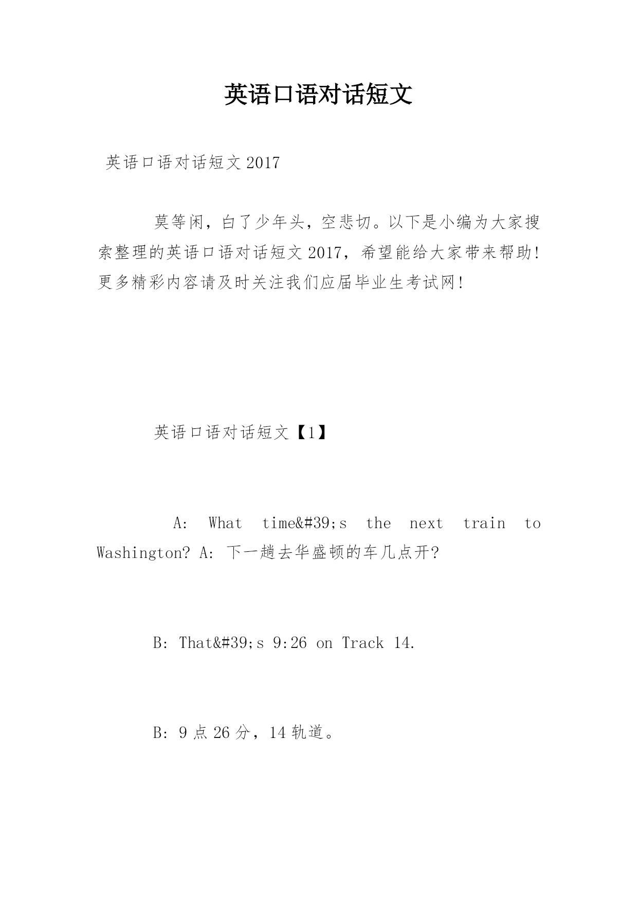 英语口语对话短文英语口语对话短文2017莫等闲,白了少年头,空悲切。以下是小编为大家搜索整理的英语口语对话短文2017,希望能给大家带来帮助!更多精彩内容请及时关注我们应届毕业生考试网!英语口语对话短文【1】A:Whattime'sthenexttraintoWashington?A:下一趟去华盛顿的车几点开?B:That's9:26onTrack14.B:9点26分,14轨道。A:Whendoesitgetthere?A:什么时候到?B:It'sscheduledtoarrive