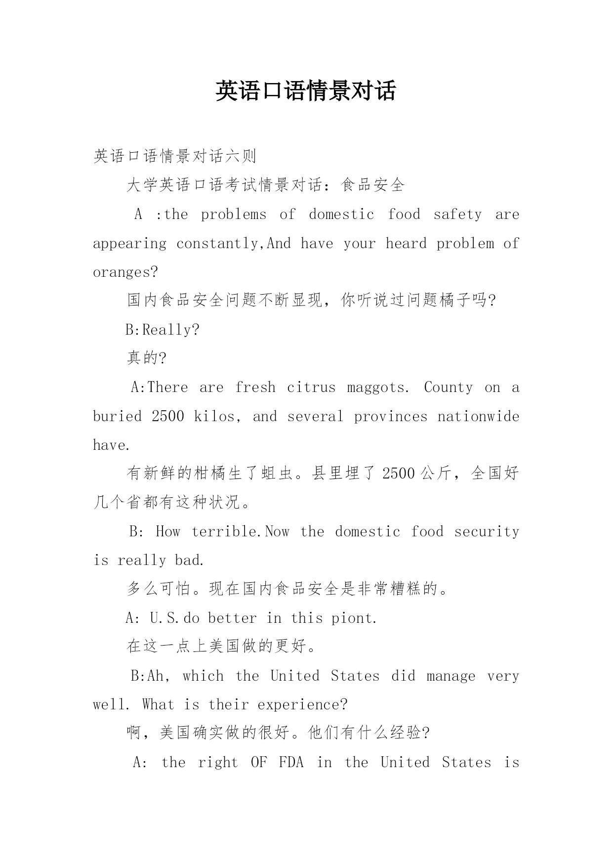 英语口语情景对话英语口语情景对话六则大学英语口语考试情景对话:食品安全A:theproblemsofdomesticfoodsafetyareappearingconstantly,Andhaveyourheardproblemoforanges?国内食品安全问题不断显现,你听说过问题橘子吗?B:Really?真的?A:Therearefreshcitrusmaggots.Countyonaburied2500kilos,andseveralprovincesnationwidehave.有新鲜的柑橘生了