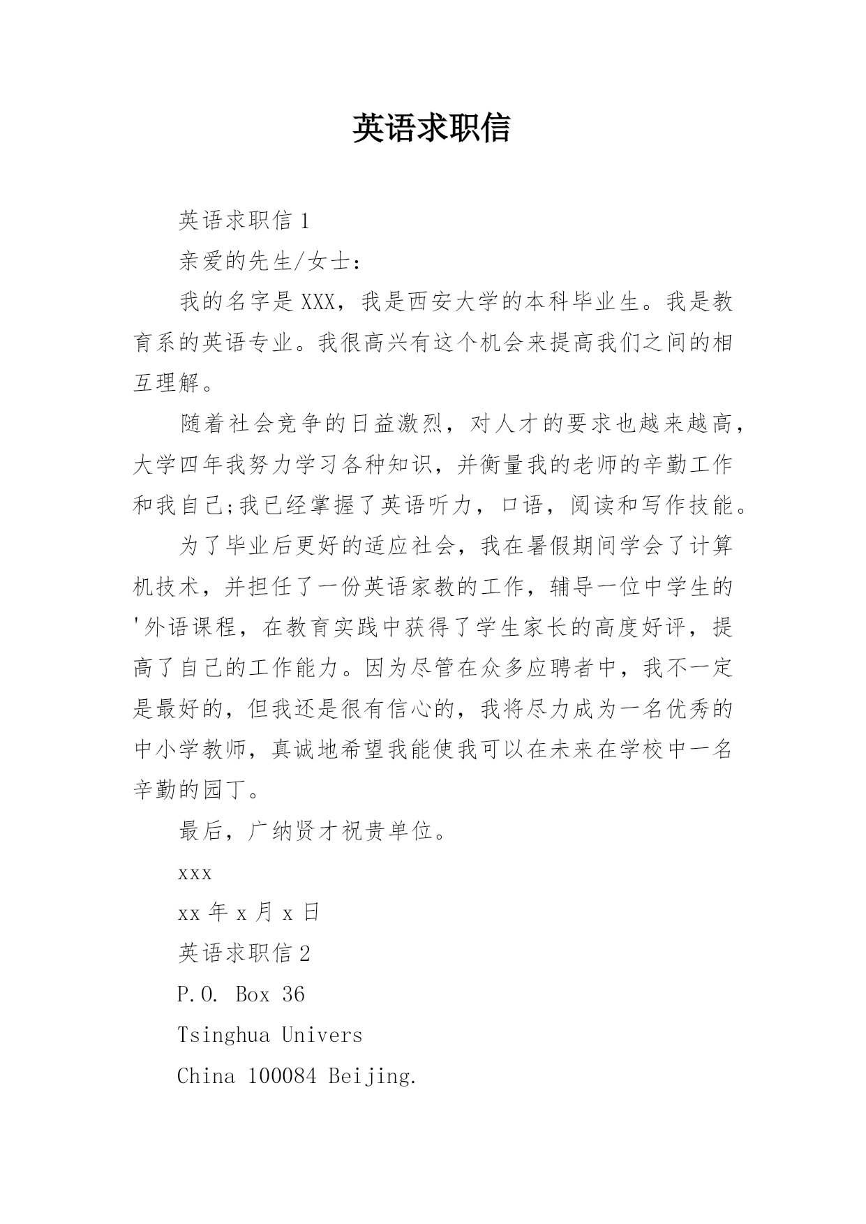 英语求职信英语求职信时间过得飞快,我们又将打开新的篇章,寻求新的工作机会,这时候需要开始写求职信了哦。千万不能认为求职信随便应付就可以喔,下面是小编为大家整理的英语求职信,希望能够帮助到大家。英语求职信篇1姓名:XXX性别:女出生日期:籍贯:黑龙江目前城市:北京市工作年限:五年以上目前年薪:5-6万人民币联系电话:13800000000E-mail:应聘方向求职行业:教育/培训应聘职位:中学教师,小学教师求职地点:北京市薪资要求:面议工作经历20xx/03—现在:XXX公司所属行业:教育/培训教育小学教师