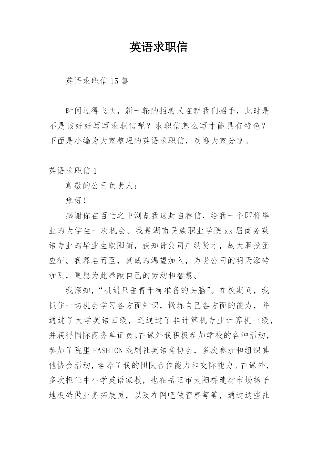 英语求职信英语求职信15篇时间过得飞快,新一轮的招聘又在朝我们招手,此时是不是该好好写写求职信呢?求职信怎么写才能具有特色?下面是小编为大家整理的英语求职信,欢迎大家分享。英语求职信1尊敬的公司负责人:您好!感谢你在百忙之中浏览我这封自荐信,给我一个即将毕业的大学生一次机会。我是湖南民族职业学院xx届商务英语专业的毕业生欧阳衡,获知贵公司广纳贤才,故大胆投函应征。我幕名而至,真诚的渴望加入,为贵公司的明天添砖加瓦,更愿为此奉献自己的劳动和智慧。我深知,“机遇只垂青于有准备的头脑”。在校期间,我抓住一切机会