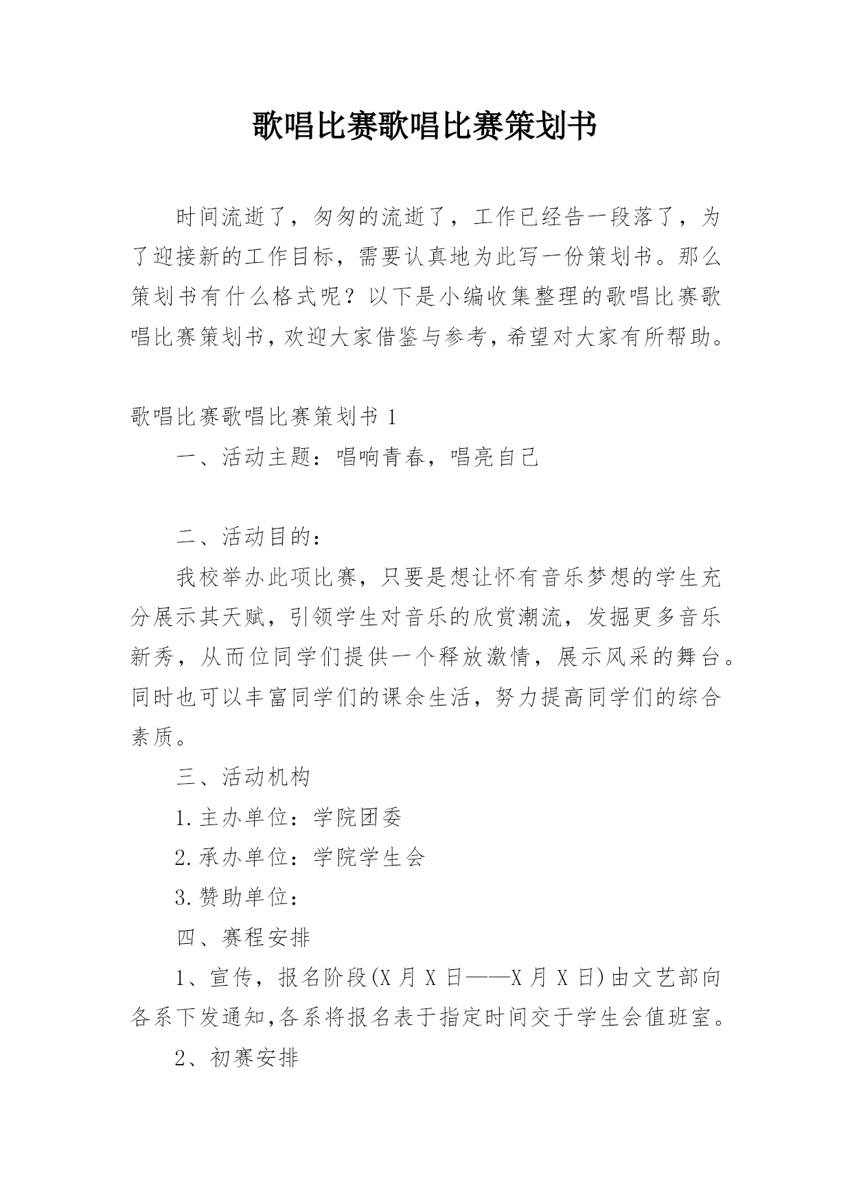 歌唱比赛歌唱比赛策划书歌唱比赛歌唱比赛策划书1一、活动主题:唱响青春,唱亮自己二、活动目的:我校举办此项比赛,只要是想让怀有音乐梦想的学生充分展示其天赋,引领学生对音乐的欣赏潮流,发掘更多音乐新秀,从而位同学们提供一个释放激情,展示风采的舞台。同时也可以丰富同学们的课余生活,努力提高同学们的综合素质。三、活动机构1.主办单位:学院团委2.承办单位:学院学生会3.赞助单位:四、赛程安排1、宣传,报名阶段(X月X日——X月X日)由文艺部向各系下发通知,各系将报名表于指定时间交于学生会值班室。2、初赛安排地点: