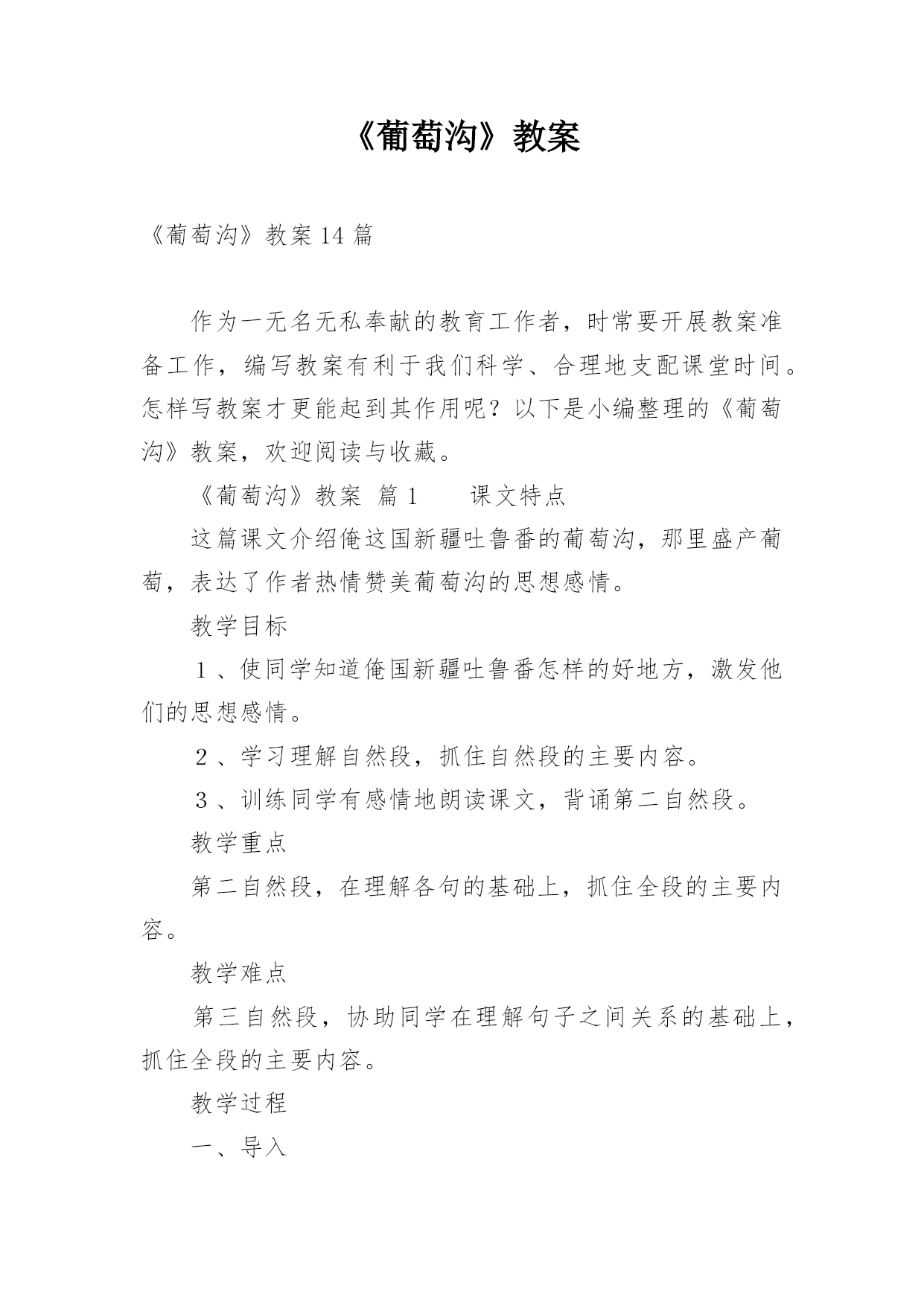 葡萄沟教案葡萄沟教案(15篇)作为一名为他人授业解惑的教育工作者,通常需要用到教案来辅助教学,教案是教学蓝图,可以有效提高教学效率。那么应当如何写教案呢?下面是小编精心整理的葡萄沟教案,欢迎大家借鉴与参考,希望对大家有所帮助。葡萄沟教案1一、教学目标:1、会读本课11个生字和由生字组成的词语。会写2个字。2、指导学生正确、流利、有感情地朗读课文。重点学习第一,第二自然段。3、认识葡萄沟真是个好地方,增强学生的爱国之情,陶冶美的情操。二、教学重点:识字,体会葡萄沟是个好地方。三、教学难点:感悟句子所包含的感