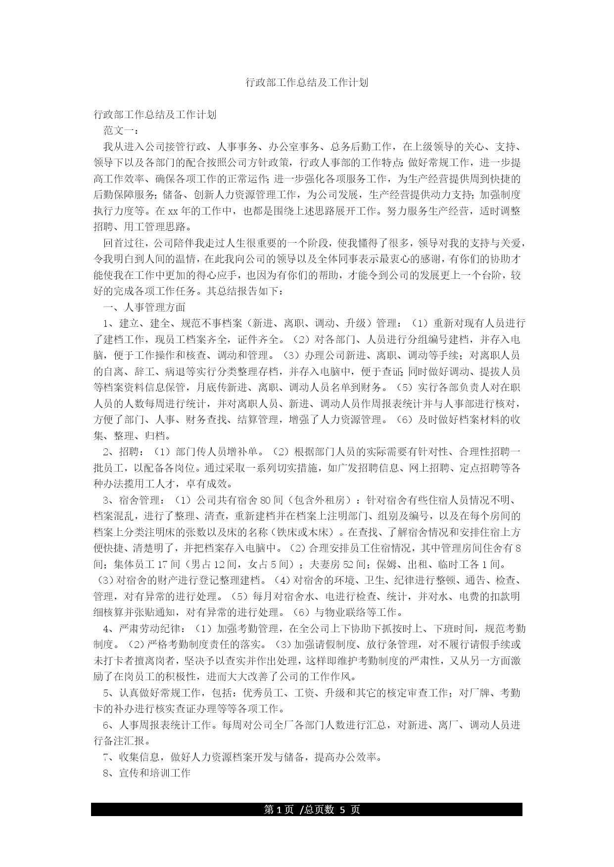 第PAGE页码5页/总页数NUMPAGES总页数5页行政部工作总结及工作计划行政部工作总结及工作计划范文一:我从进入公司接管行政、人事事务、办公室事务、总务后勤工作,在上级领导的关心、支持、领导下以及各部门的配合按照公司方针政策,行政人事部的工作特点:做好常规工作,进一步提高工作效率、确保各项工作的正常运作;进一步强化各项服务工作,为生产经营提供周到快捷的后勤保障服务;储备、创新人力资源管理工作,为公司发展,生产经营提供动力支持;加强制度执行力度等。在xx年的工作中,也都是围绕上述思路展开工作