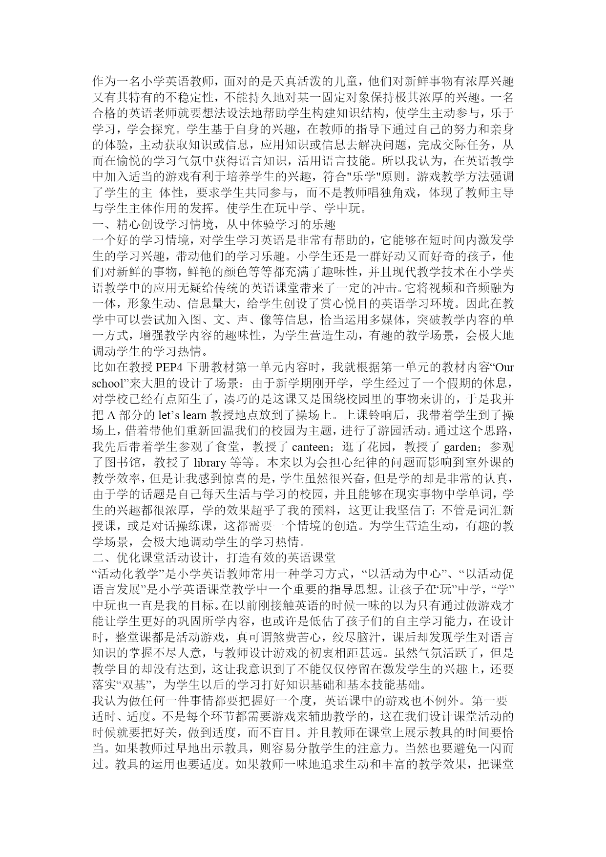 作为一名小学英语教师,面对的是天真活泼的儿童,他们对新鲜事物有浓厚兴趣又有其特有的不稳定性,不能持久地对某一固定对象保持极其浓厚的兴趣。一名合格的英语老师就要想法设法地帮助学生构建知识结构,使学生主动参与,乐于学习,学会探究。学生基于自身的兴趣,在教师的指导下通过自己的努力和亲身的体验,主动获取知识或信息,应用知识或信息去解决问题,完成交际任务,从而在愉悦的学习气氛中获得语言知识,活用语言技能。所以我认为,在英语教学中加入适当的游戏有利于培养学生的兴趣,符合"乐学"原则。游戏教学方法强调了学生的主体性,要