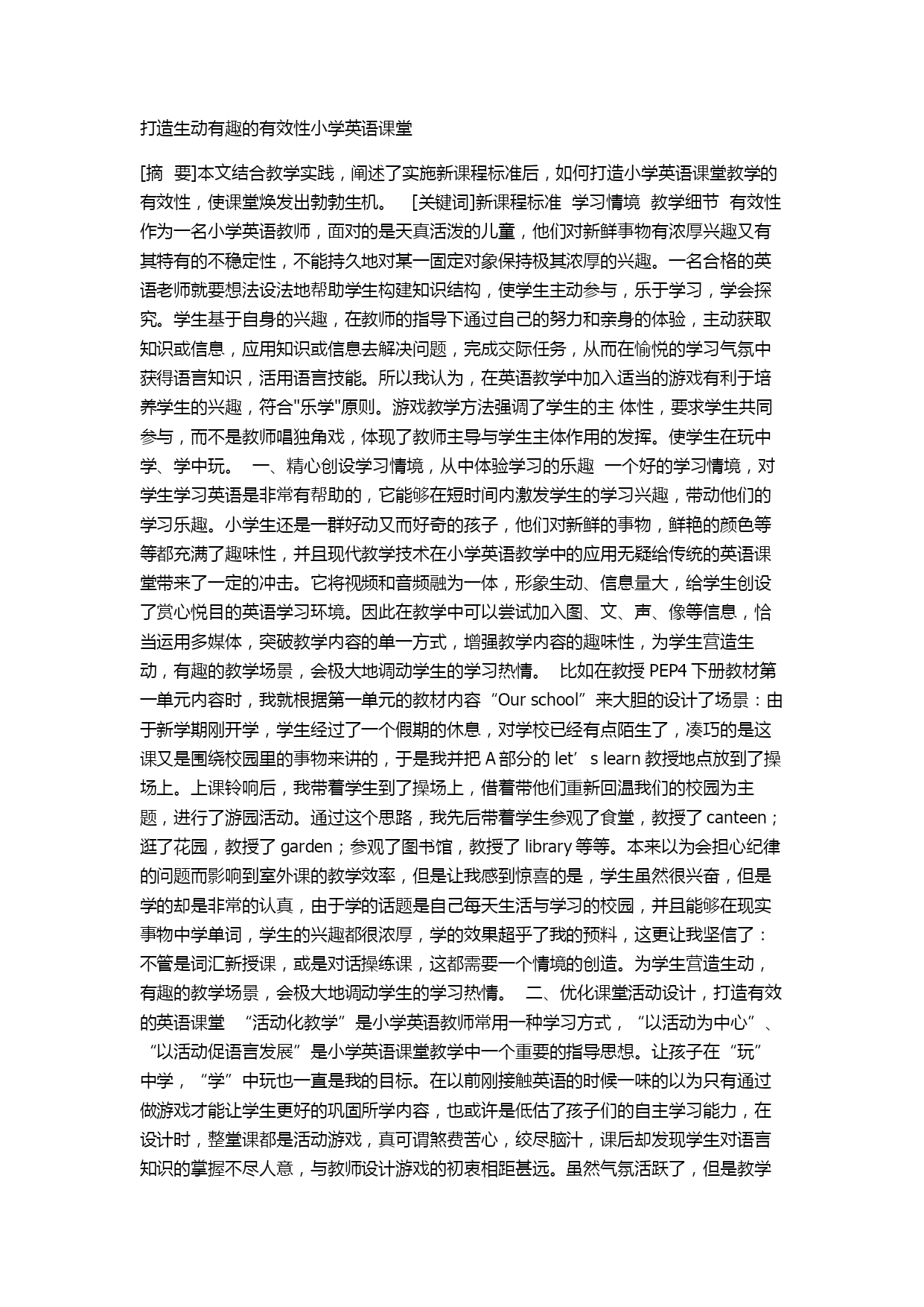 打造生动有趣的有效性小学英语课堂[摘要]本文结合教学实践,阐述了实施新课程标准后,如何打造小学英语课堂教学的有效性,使课堂焕发出勃勃生机。[关键词]新课程标准学习情境教学细节有效性作为一名小学英语教师,面对的是天真活泼的儿童,他们对新鲜事物有浓厚兴趣又有其特有的不稳定性,不能持久地对某一固定对象保持极其浓厚的兴趣。一名合格的英语老师就要想法设法地帮助学生构建知识结构,使学生主动参与,乐于学习,学会探究。学生基于自身的兴趣,在教师的指导下通过自己的努力和亲身的体验,主动获取知识或信息,应用知识或信息去解决问