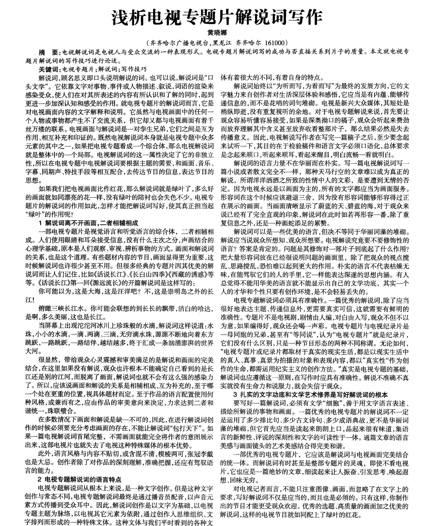 第一篇:谈电视专题片解说词的写作谈电视专题片解说词的写作解说词,顾名思义即口头说明解说的词。也可以说,解说词是“口头文学”。它依靠文字对事物、事件或人物描述、叙说,词语的渲染来感染受众,使人们在对其所表述的内容有所认识和了解的同时,起到更进一步加深认知和感受的作用。就电视专题片的解说词而言,它是对电视画面内容的文字解释和说明。它虽然与电视画面中的任何一个人物或事物都产生不了交流关系,但它却又都与电视画面有着千丝万缕的联系。电视画面与解说词是一对孪生兄弟,它们之间是互为作用、相互补充和印证的。如果在解说词中讲到乌云突变、大风骤起时,这边电视画面就不可能出现晴空万里、风和日丽的场景;而如果画面中是人潮涌动的铁路春运的场面,可解说词却用上了欢欢喜喜过大年的词句,这就使人很费解了。虽然观众在看电视节目的时候,注意的是画面,但解说词的作用仍不可忽略。在某些情况下,解说词还占在很重要的位置上。画面与解说词出现“驴唇不对马嘴”的现象,必然影响节目的整体表现效果,即使再优美的画面也弥补不了“文不对画”的缺憾。当然,有些优秀的电视专题片即使没有多少解说词,也没有影响观众对节目内容主题的理解,那是因为仅有的一点儿解说词起到了画龙点睛的作用,产生的是指点迷津的效果,而再多用上些解说词倒显得画蛇添足了。如果我们把电视画面比作红花,那么解说词就是绿叶了,多么好的画面就如同漂亮的花一样,没有绿叶的陪衬也会失色不少。电视专题片的解说词的作用如此,怎样才能把解说词写好,使其真正担当起“绿叶”的作用呢?我以为,应从以下三方面做起和努力。一、对采访对象的详实了解、深入体验是写好解说词的前提俗话说,巧妇难为无米之炊。这就好比电视记者没有充足的第一手材料是不可能写出好的解说词的。现在,有些电视记者采访,拎起摄像机就走,扛上摄像机就拍,只注意画面质量,不去深入采访,解说词是在人家准备好的文字材料上圈圈点点了事。更有甚者,干脆将报刊上发表过的文字拿来,“造就”了一篇解说词。这样的解说词毫无自己的见解和思想,没有任何深度和广度,这样的电视节目又怎能赢得观众呢?前期的深入采访对后期的解说词的写作非常重要,没有这个过程,没有切身的体验和感受,就不可能写出让观众信服、感人的解说词。这就像作家、画家为创作必须去体验生活一样。没有他们身临其境地去体验某种生活的经历,而只坐在家里凭空想象“闭门造车”,是不可能创作出优秀的作品的。因此说,亲临新闻现场、深入采访,尽可能多地掌握素材和信息是写作好解说词的第一步。二、融入真挚情感、表达真诚的内心世界是写好解说词的关键有了深入细致的第一线采访,这就为写好解说词奠定了基础。而在你真正动笔写解说词之前,首先要充分思考,围绕专题片的主题进行构思,然后一气呵成。在写作过程中,一定要把你在采访中和采访后的感受、观点表达出来。必须把自己的感情世界融入其中,将内心的情感用文字淋漓尽致地写出来。可以相信,在这种境况下写出来的解说词也定会打动观众的心。相反,同样是在作一个电视专题节目,在整个采访过程中,如果没有打动你的心或引起你的兴趣的地方,你肯定不会写出打动观众心的解说词。只有你对采访对象、镜头中所表现的内容或你想说明的事物感情真挚、兴趣十足、关心专注,这样你写出来的解说词才会感染观众。三、扎实的文字功底和文学艺术修养是写好解说词的根本有人说,前期采访我也很认真,坐下来开始写解说词我也很投入,可写出来的解说词就是不能打动人。我想主要原因那就是文字功底欠缺了。头脑里没东西,肯定倒不出“货”来。如果知识面广、文字能力强,那语言的组合就会很顺畅,文字的表述就如同源涌般溢出。因此,要写好一篇解说词,必须有文学“细胞”,善于用文字语言表述、描绘所解说的事物和画面。现在的电视专题片解说词很少讲究遣词造句、语法修辞,而更多的是些公式化、简单化、不生动、干巴巴的文字罗列或一些数据排序充斥整篇文章。有的就是一篇工作报告或总结报表,就连播音员配音时读起这样的解说词来都感受乏味得很。这样的专题节目若受看才怪呢?一篇优秀的电视专题片的解说词不一定是运用了多少排比句、多少古文诗句、多少成语典故,更不是华丽词藻的堆砌,但它首先应当是读起来朗朗上口,品起来很有味道,集语言的新鲜性、评说的深刻性和文字的可读性于一体。通篇文章的语言美感与画面镜头的艺术美感结合得完美和谐。一部优秀的电视专题片,它应该是解说词与电视画面完美结合的统一体。而解说词有时甚至是整部专题片的灵魂,即使不看电视片,它也应是一篇绝妙的文章,细读起来让人振奋、引发思考、唤起遐想、回味无穷。深入采访、融入真情、文字功夫是写好电视专题片解说词的重要三步。对电视记者而言,不能只注重图像、画面,而忽略了在文字上的要求,写好解说词不仅是应当的,而且也是必须的。只有这样,你制作出的节目才能更受观众欢迎。优秀的