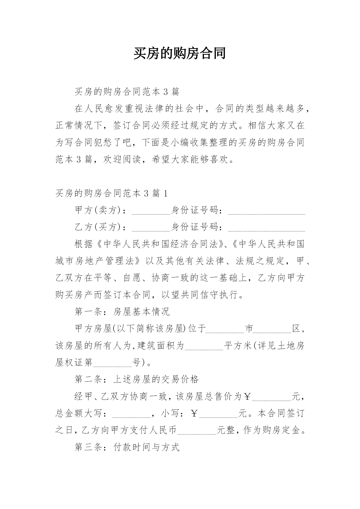 买房的购房合同买房的购房合同范本3篇1甲方(卖方):________身份证号码:________________乙方(买方):________身份证号码:________________根据《中华人民共和国经济合同法》、《中华人民共和国城市房地产管理法》以及其他有关法律、法规之规定,甲、乙双方在平等、自愿、协商一致的这一基础上,乙方向甲方购买房产而签订本合同,以望共同信守执行。第一条:房屋基本情况甲方房屋(以下简称该房屋)位于________市________区,该房屋的所有人为,建筑面积为_______
