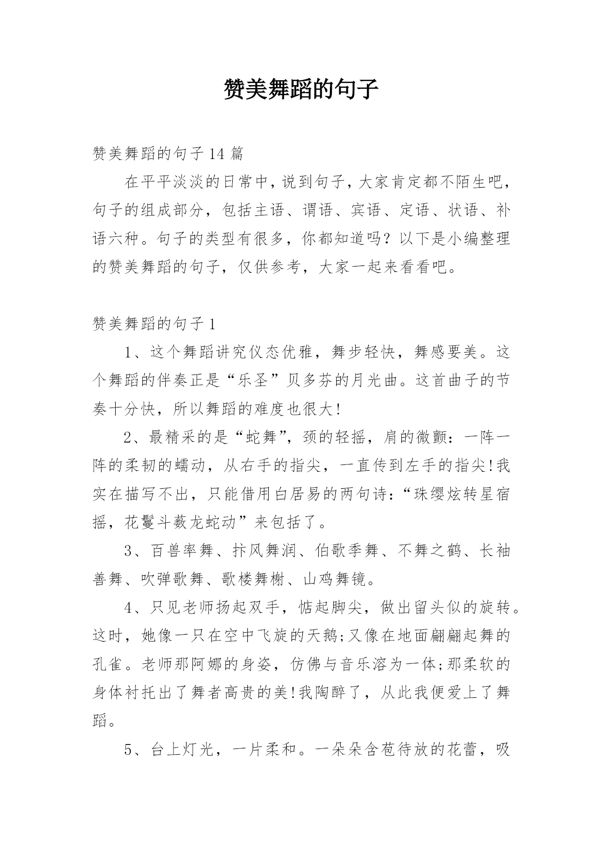 赞美舞蹈的句子赞美舞蹈的句子14篇在平平淡淡的日常中,说到句子,大家肯定都不陌生吧,句子的组成部分,包括主语、谓语、宾语、定语、状语、补语六种。句子的类型有很多,你都知道吗?以下是小编整理的赞美舞蹈的句子,仅供参考,大家一起来看看吧。赞美舞蹈的句子11、这个舞蹈讲究仪态优雅,舞步轻快,舞感要美。这个舞蹈的伴奏正是“乐圣”贝多芬的月光曲。这首曲子的节奏十分快,所以舞蹈的难度也很大!2、最精采的是“蛇舞”,颈的轻摇,肩的微颤:一阵一阵的柔韧的蠕动,从右手的指尖,一直传到左手的指尖!我实在描写不出,只能借用白居
