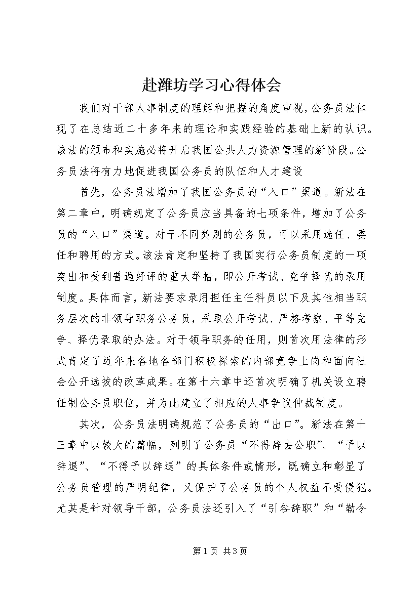 赴潍坊学习心得体会我们得到了一些心得体会以后,不妨将其写成一篇心得体会,让自己铭记于心,从而不断地丰富我们的思想。那么心得体会怎么写才恰当呢?以下是小编为大家收集的赴潍坊学习心得体会,欢迎大家分享。赴潍坊学习心得体会1我们对干部人事制度的理解和把握的角度审视,公务员法体现了在总结近二十多年来的理论和实践经验的基础上新的认识。该法的颁布和实施必将开启我国公共人力资源管理的新阶段。公务员法将有力地促进我国公务员的队伍和人才建设首先,公务员法增加了我国公务员的“入口”渠道。新法在第二章中,明确规定了公务员应当具