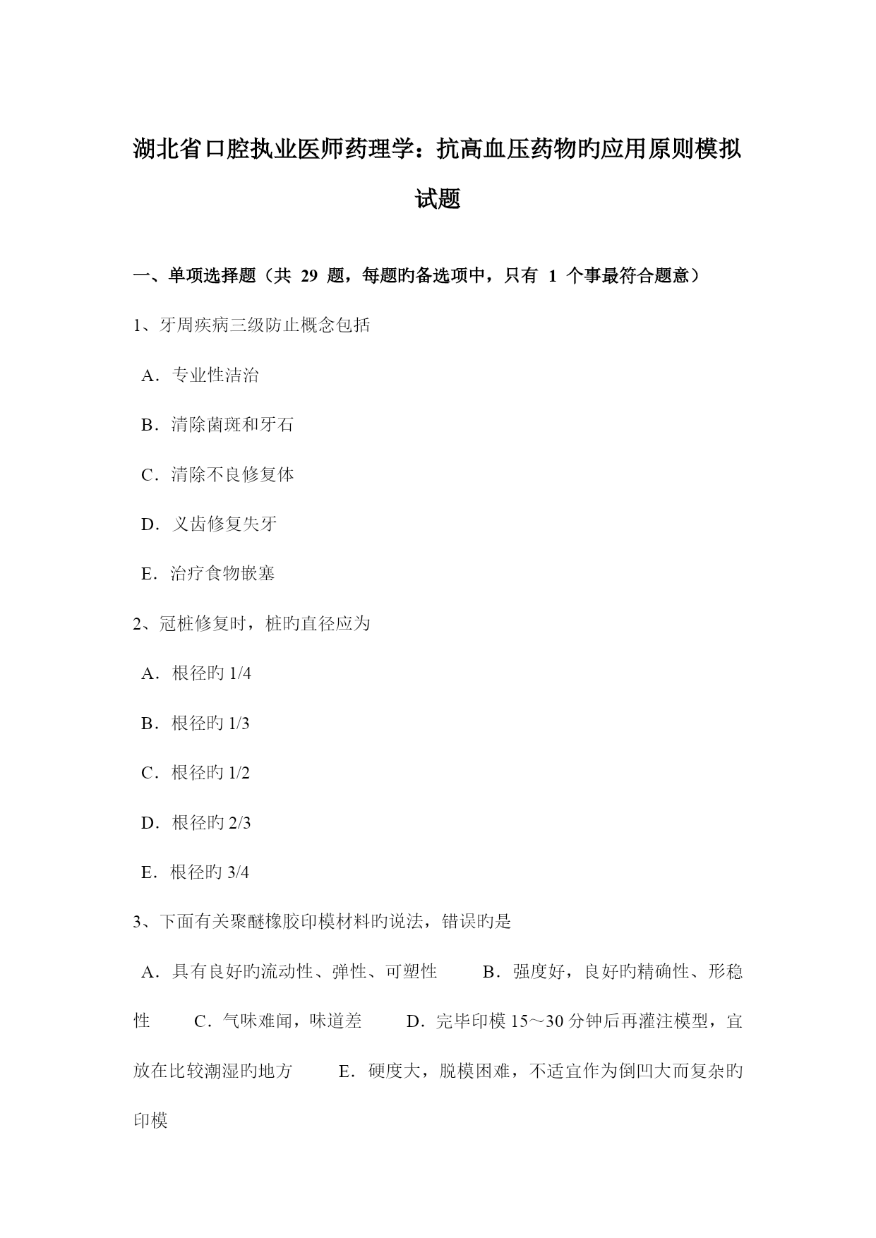 2023年湖北省口腔执业医师药理学抗高血压药物的应用原则模拟试题.docx