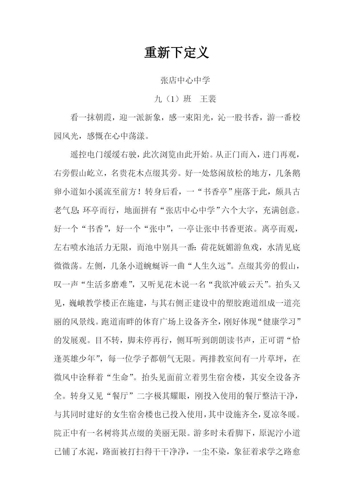 重新下定义张店中心中学九(1)班王裴看一抹朝霞,迎一派新象,感一束阳光,沁一股书香,游一番校园风光,感慨在心中荡漾。遥控电门缓缓右驶,此次浏览由此开始。从正门而入,进门再观,右旁假山屹立,名贵花木点缀其旁。好一处悠闲放松的地方,几条鹅卵小道如小溪流至前方!转身后看,一“书香亭”座落于此,颇具古老气息;环亭而行,地面拼有“张店中心中学”六个大字,充满创意。好一个“书香”,好一个“张中”,一亭让张中书香更浓。离亭而观,左右喷水池活力无限,而池中别具一番:荷花妩媚游鱼戏,水清见底微微荡。左侧,几条小道蜿蜒诉一曲