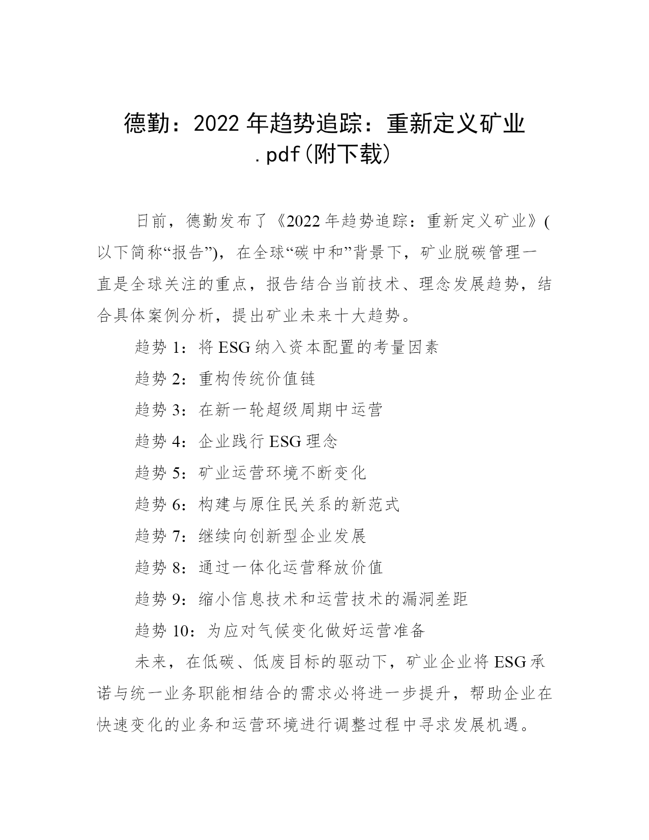 德勤:2022年趋势追踪:重新定义矿业.pdf(附下载)日前,德勤发布了《2022年趋势追踪:重新定义矿业》(以下简称“报告”),在全球“碳中和”背景下,矿业脱碳管理一直是全球关注的重点,报告结合当前技术、理念发展趋势,结合具体案例分析,提出矿业未来十大趋势。趋势1:将ESG纳入资本配置的考量因素趋势2:重构传统价值链趋势3:在新一轮超级周期中运营趋势4:企业践行ESG理念趋势5:矿业运营环境不断变化趋势6:构建与原住民关系的新范式趋势7:继续向创新型企业发展趋势8:通过一体化运营释放价值趋势9:缩小信息