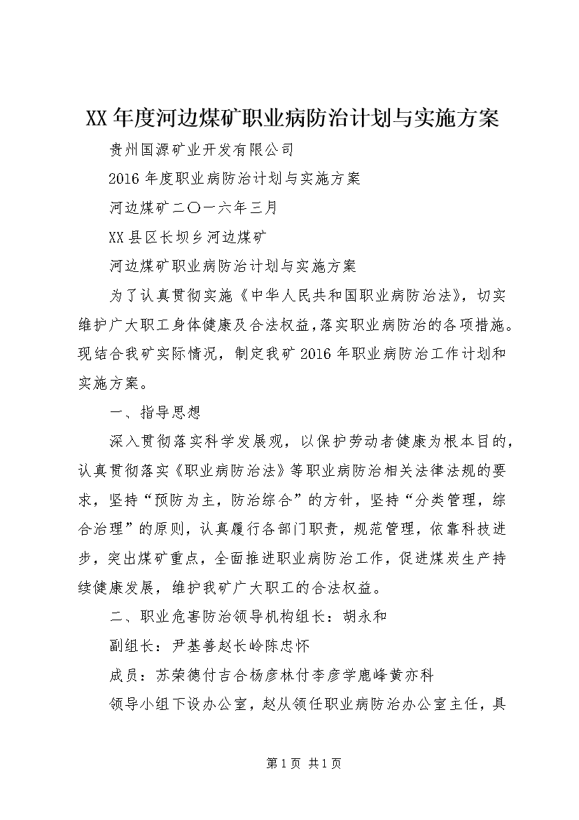 XX年度河边煤矿职业病防治计划与实施方案贵州国源矿业开发有限公司2016年度职业病防治计划与实施方案河边煤矿二〇一六年三月XX县区长坝乡河边煤矿河边煤矿职业病防治计划与实施方案为了认真贯彻实施《中华人民共和国职业病防治法》,切实维护广大职工身体健康及合法权益,落实职业病防治的各项措施。现结合我矿实际情况,制定我矿2016年职业病防治工作计划和实施方案。一、指导思想深入贯彻落实科学发展观,以保护劳动者健康为根本目的,认真贯彻落实《职业病防治法》等职业病防治相关法律法规的要求,坚持“预防为主,防治