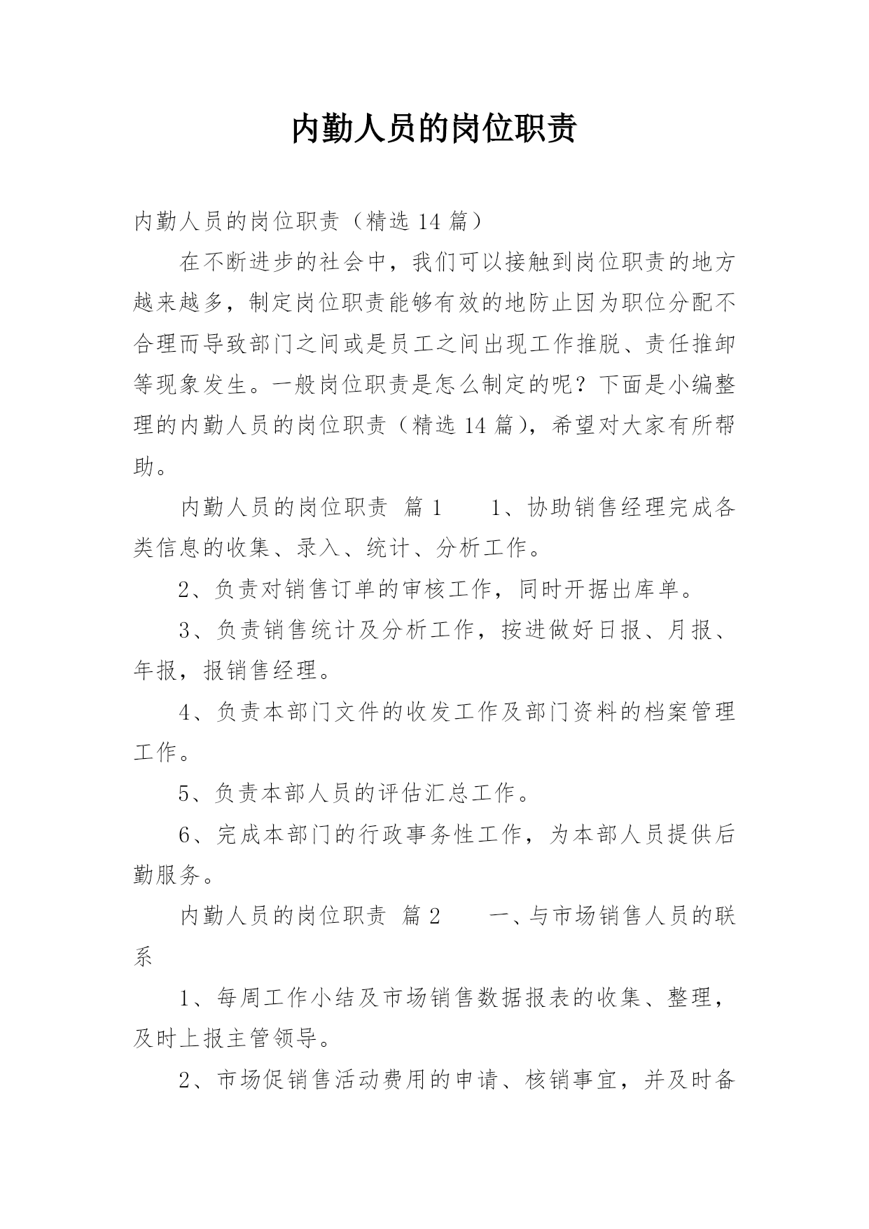 内勤人员的岗位职责内勤人员的岗位职责(精选14篇)在不断进步的社会中,我们可以接触到岗位职责的地方越来越多,制定岗位职责能够有效的地防止因为职位分配不合理而导致部门之间或是员工之间出现工作推脱、责任推卸等现象发生。一般岗位职责是怎么制定的呢?下面是小编整理的内勤人员的岗位职责(精选14篇),希望对大家有所帮助。内勤人员的岗位职责篇11、协助销售经理完成各类信息的收集、录入、统计、分析工作。2、负责对销售订单的审核工作,同时开据出库单。3、负责销售统计及分析工作,按进做好日报、月报、年报,报销售经理。4、负