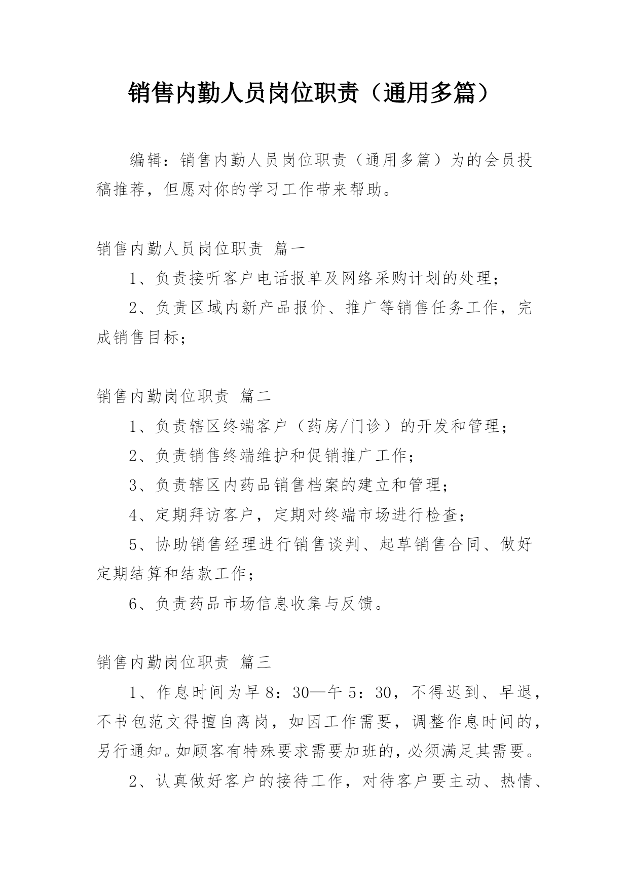 销售内勤人员岗位职责(通用多篇)编辑:销售内勤人员岗位职责(通用多篇)为的会员投稿推荐,但愿对你的学习工作带来帮助。销售内勤人员岗位职责篇一1、负责接听客户电话报单及网络采购计划的处理;2、负责区域内新产品报价、推广等销售任务工作,完成销售目标;销售内勤岗位职责篇二1、负责辖区终端客户(药房/门诊)的开发和管理;2、负责销售终端维护和促销推广工作;3、负责辖区内药品销售档案的建立和管理;4、定期拜访客户,定期对终端市场进行检查;5、协助销售经理进行销售谈判、起草销售合同、做好定期结算和结款工作;6、负责药