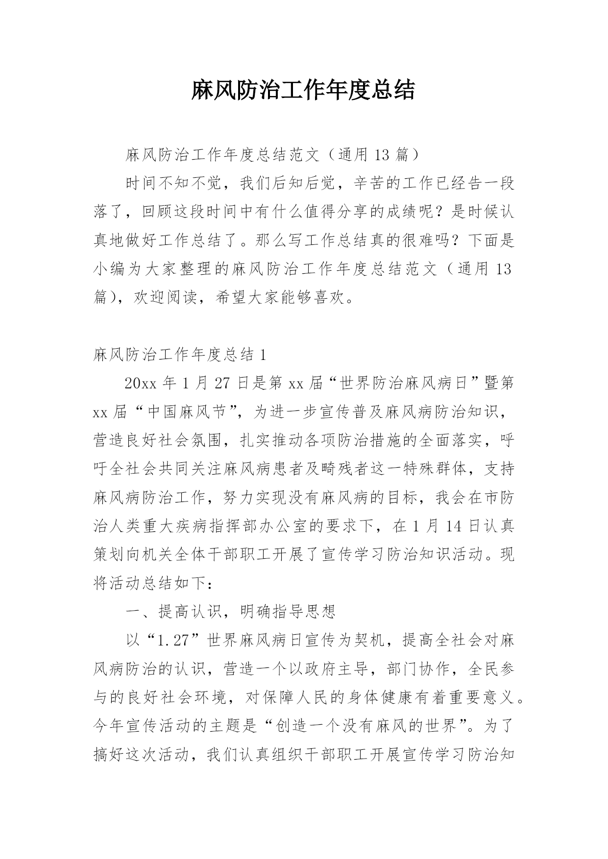 麻风防治工作年度总结麻风防治工作年度总结范文(通用13篇)时间不知不觉,我们后知后觉,辛苦的工作已经告一段落了,回顾这段时间中有什么值得分享的成绩呢?是时候认真地做好工作总结了。那么写工作总结真的很难吗?下面是小编为大家整理的麻风防治工作年度总结范文(通用13篇),欢迎阅读,希望大家能够喜欢。麻风防治工作年度总结120xx年1月27日是第xx届“世界防治麻风病日”暨第xx届“中国麻风节”,为进一步宣传普及麻风病防治知识,营造良好社会氛围,扎实推动各项防治措施的全面落实,呼吁全社会共同关注麻风病患者及畸残者