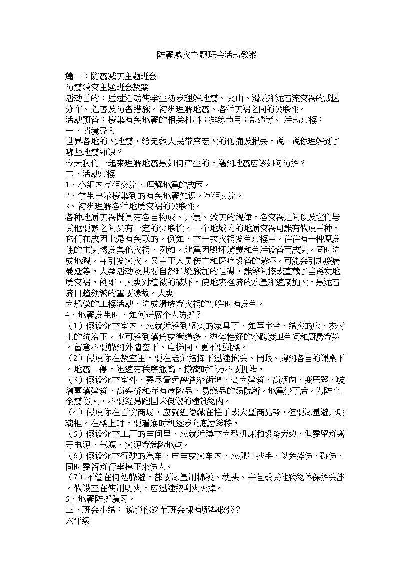 防震减灾主题班会活动教案篇一:防震减灾主题班会防震减灾主题班会教案活动目的:通过活动使学生初步理解地震、火山、滑坡和泥石流灾祸的成因分布、危害及防备措施。初步理解地震、各种灾祸之间的关联性。活动预备:搜集有关地震的相关材料;排练节目;制造等。活动过程:一、情境导入世界各地的大地震给无数人民带来宏大的伤痛及损失说一说你理解到了哪些地震知识?今天我们一起来理解地震是如何产生的遇到地震应该如何防护?二、活动过程1、小组内互相交流理解地震的成因。2、学生出示搜集到的有关地震知识互相交流。3、初步理解各种地质灾祸