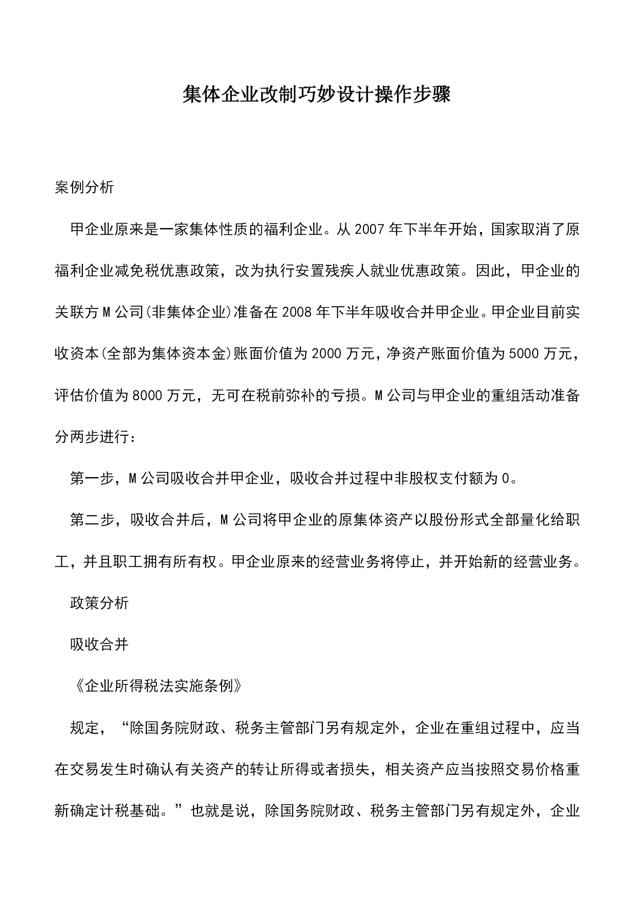 集体企业改制巧妙设计操作步骤案例分析甲企业原来是一家集体性质的福利企业。从2007年下半年开始,国家取消了原福利企业减免税优惠政策,改为执行安置残疾人就业优惠政策。因此,甲企业的关联方M公司(非集体企业)准备在2008年下半年吸收合并甲企业。甲企业目前实收资本(全部为集体资本金)账面价值为2000万元,净资产账面价值为5000万元,评估价值为8000万元,无可在税前弥补的亏损。M公司与甲企业的重组活动准备分两步进行:第一步,M公司吸收合并甲企业,吸收合并过程中非股权支付额为0。第二步,吸收合并后,M公司将