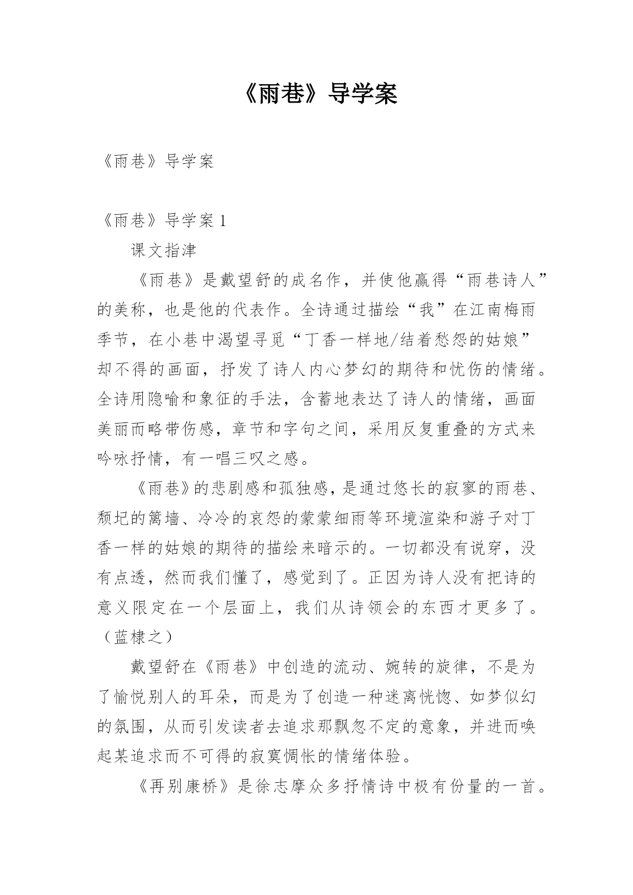 《雨巷》导学案戴望舒的诗深蕴中国古典诗词中婉约、清丽诗风的韵致,但又受到法国象征诗歌派的影响,因而他的早期诗作总体上表现出一种孤独、抑郁和消沉的特点。《雨巷》就是其中的代表。下面小编给大家带来《雨巷》导学案。希望能够帮到大家。《雨巷》导学案学习目标:1.分析理解本诗的中心意象和象征意味;能有感情的朗诵诗歌。2.领悟作者的思想情感,感受诗歌的情境美。3.通过诵读欣赏,增强对诗歌的分析能力。学习重难点:1.反复诵读体会诗歌营造的意境。2.分析诗歌中心意象,体会诗人情感。课前预习一.知识链接:《雨巷》最初发表在