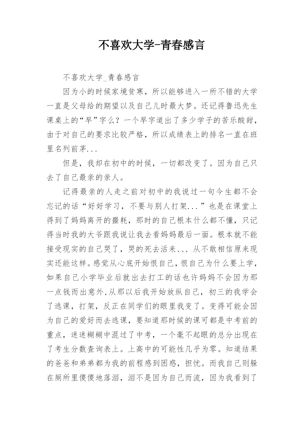 不喜欢大学-青春感言不喜欢大学_青春感言因为小的时候家境贫寒,所以能够进入一所不错的大学一直是父母给的期望以及自己儿时最大梦。还记得鲁迅先生课桌上的“早”字么?一个早字道出了多少学子的苦乐酸甜,由于对自己的要求比较严格,所以成绩表上的排名一直在班里名列前茅...但是,我却在初中的时候,一切都改变了。因为自己只去了自己最亲的亲人。记得最亲的人走之前对初中的我说过一句今生都不会忘记的话“好好学习,不要与别人打架...”也是在课堂上得到了妈妈离开的噩耗,那时的自己根本什么都不懂,只记得当时我的大爷跟我说让我去看