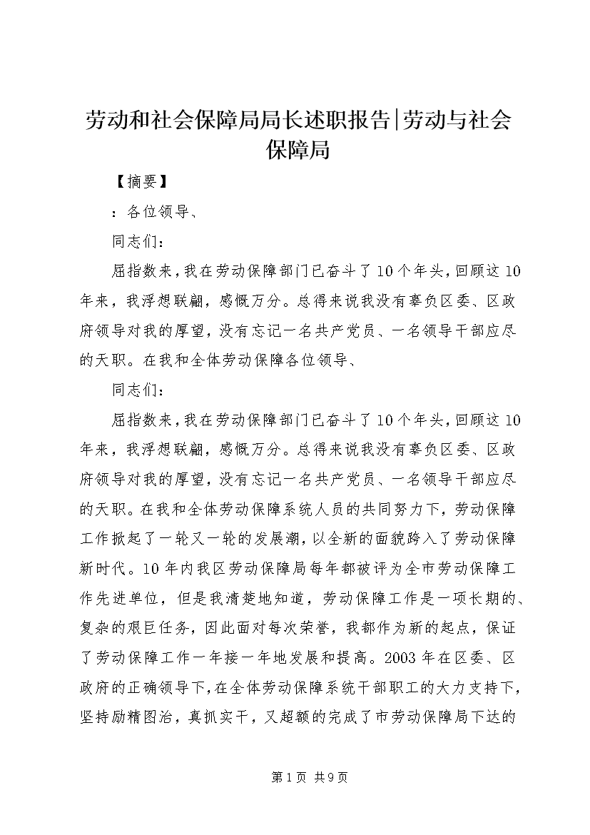 第PAGE\*Arabic\*MERGEFORMAT9页共NUMPAGES\*MERGEFORMAT9页劳动和社会保障局局长述职报告|劳动与社会保障局【摘要】:各位领导、同志们:屈指数来,我在劳动保障部门已奋斗了10个年头,回顾这10年来,我浮想联翩,感慨万分。总得来说我没有辜负区委、区政府领导对我的厚望,没有忘记一名共产党员、一名领导干部应尽的天职。在我和全体劳动保障各位领导、同志们:屈指数来,我在劳动保障部门已奋斗了10个年头,回顾这10年来,我浮想联翩,感慨万分。总得来说我没有辜负区委、