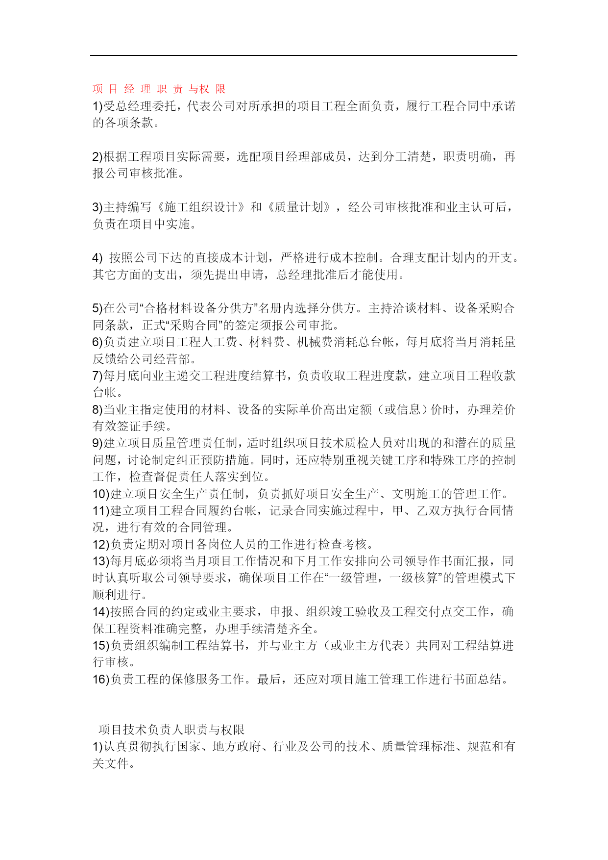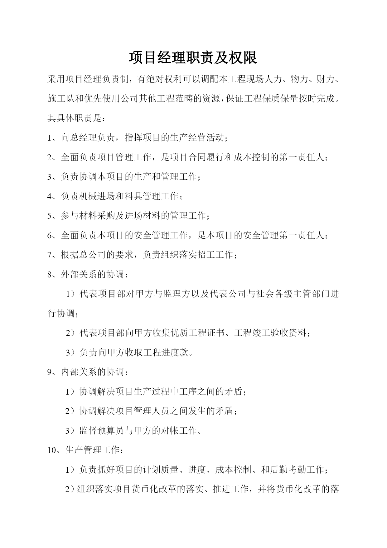 项目经理职责及权限采用项目经理负责制,有绝对权利可以调配本工程现场人力、物力、财力、施工队和优先使用公司其他工程范畴的资源,保证工程保质保量按时完成。其具体职责是:向总经理负责,指挥项目的生产经营活动;全面负责项目管理工作,是项目合同履行和成本控制的第一责任人;负责协调本项目的生产和管理工作;负责机械进场和料具管理工作;参与材料采购及进场材料的管理工作;全面负责本项目的安全管理工作,是本项目的安全管理第一责任人;根据总公司的要求,负责组织落实招工工作;外部关系的协调:代表项目部对甲方与监理方以及代表公司与