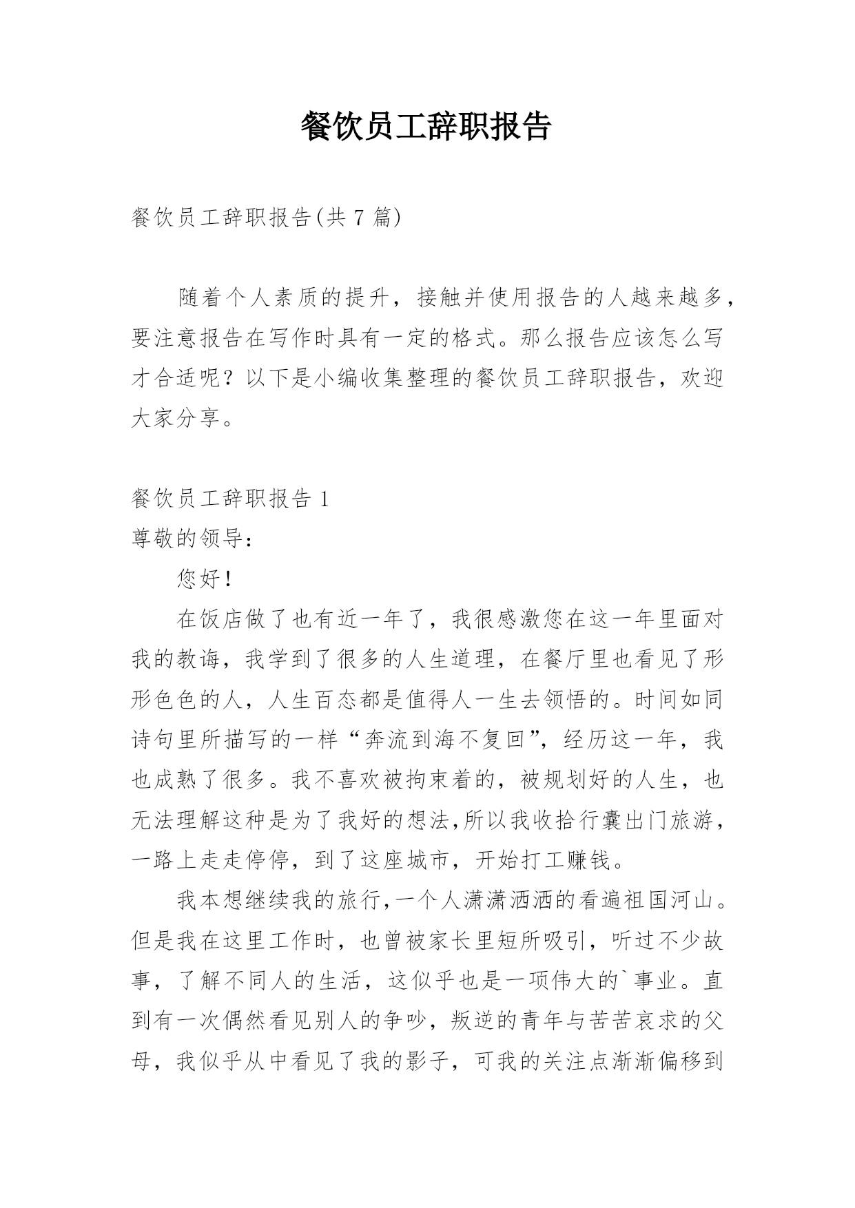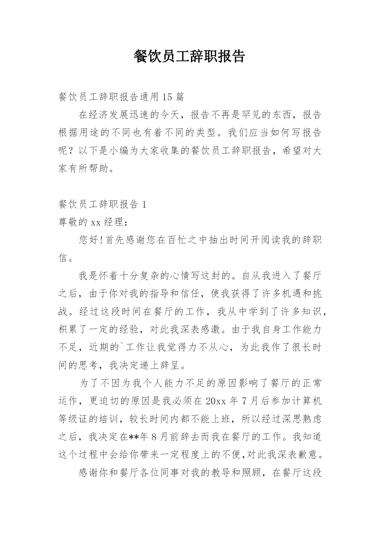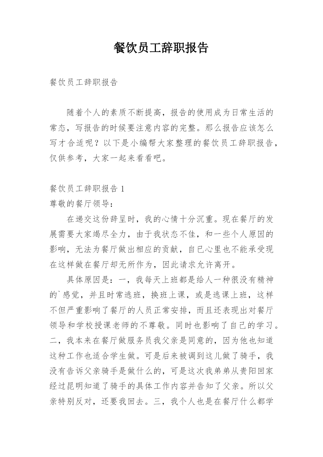餐饮员工辞职报告餐饮员工辞职报告随着个人的素质不断提高,报告的使用成为日常生活的常态,写报告的时候要注意内容的完整。那么报告应该怎么写才合适呢?以下是小编帮大家整理的餐饮员工辞职报告,仅供参考,大家一起来看看吧。餐饮员工辞职报告1尊敬的餐厅领导:在递交这份辞呈时,我的心情十分沉重。现在餐厅的发展需要大家竭尽全力,由于我状态不佳,和一些个人原因的影响,无法为餐厅做出相应的贡献,自已心里也不能承受现在这样做在餐厅却无所作为,因此请求允许离开。具体原因是:一,我每天上班都是给人一种很没有精神的`感觉,并且时常逃