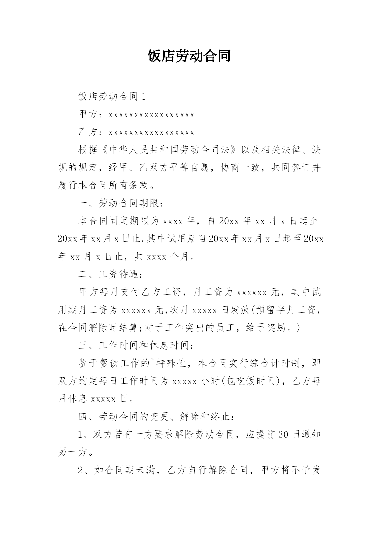 饭店劳动合同饭店劳动合同1甲方:xxxxxxxxxxxxxxxxx乙方:xxxxxxxxxxxxxxxxx根据《中华人民共和国劳动合同法》以及相关法律、法规的规定,经甲、乙双方平等自愿,协商一致,共同签订并履行本合同所有条款。一、劳动合同期限:本合同固定期限为xxxx年,自20xx年xx月x日起至20xx年xx月x日止。其中试用期自20xx年xx月x日起至20xx年xx月x日止,共xxxx个月。二、工资待遇:甲方每月支付乙方工资,月工资为xxxxxx元,其中试用期月工资为xxxxxx元,次月xxxxx日发