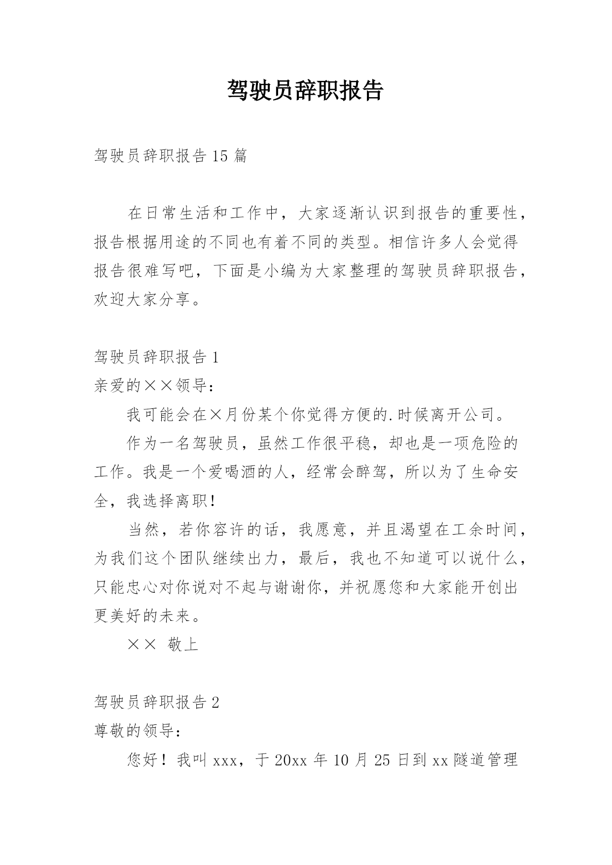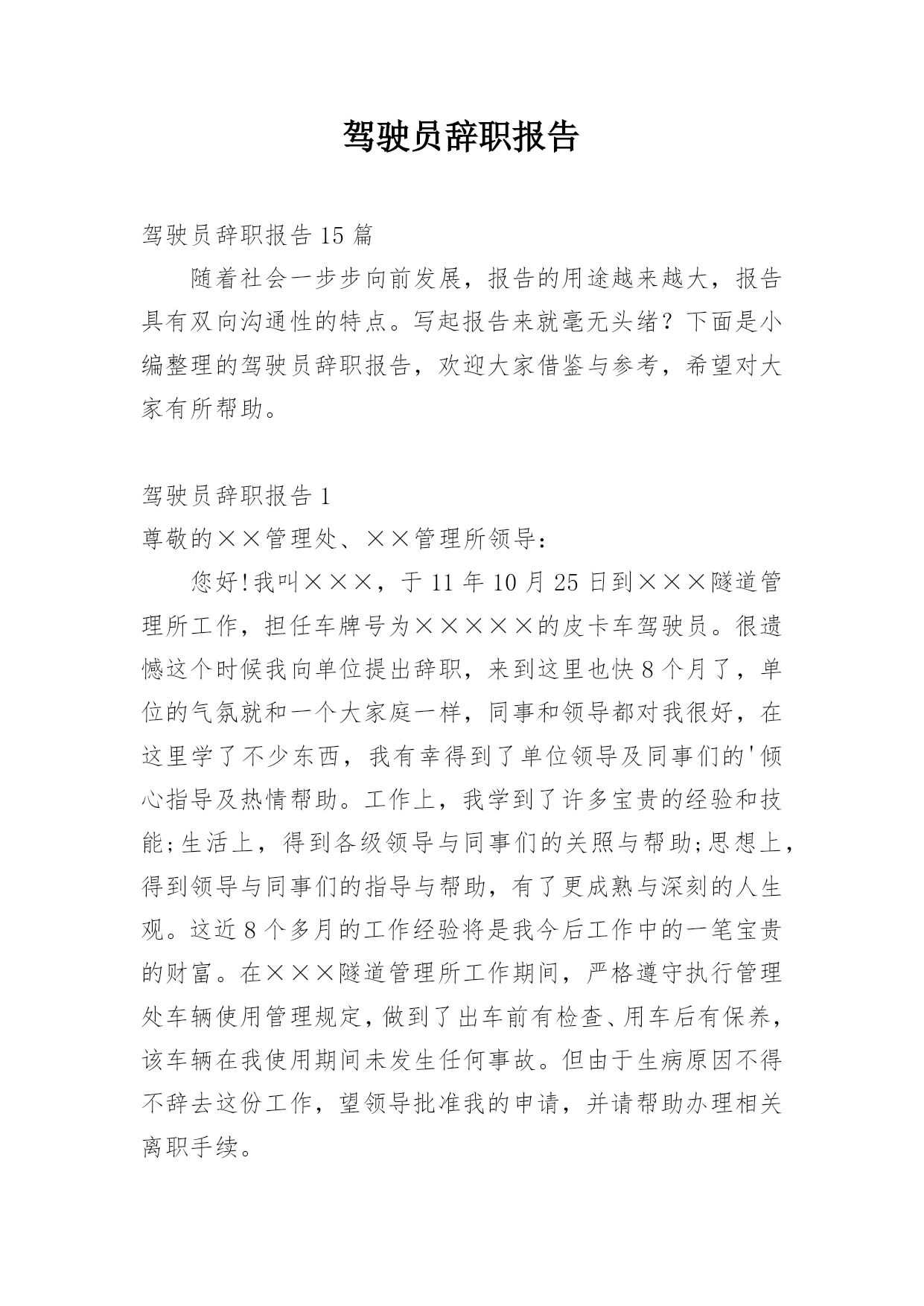 驾驶员辞职报告驾驶员辞职报告15篇在日常生活和工作中,大家逐渐认识到报告的重要性,报告根据用途的不同也有着不同的类型。相信许多人会觉得报告很难写吧,下面是小编为大家整理的驾驶员辞职报告,欢迎大家分享。驾驶员辞职报告1亲爱的××领导:我可能会在×月份某个你觉得方便的.时候离开公司。作为一名驾驶员,虽然工作很平稳,却也是一项危险的工作。我是一个爱喝酒的人,经常会醉驾,所以为了生命安全,我选择离职!当然,若你容许的话,我愿意,并且渴望在工余时间,为我们这个团队继续出力,最后,我也不知道可以说什么,只能忠心对你说