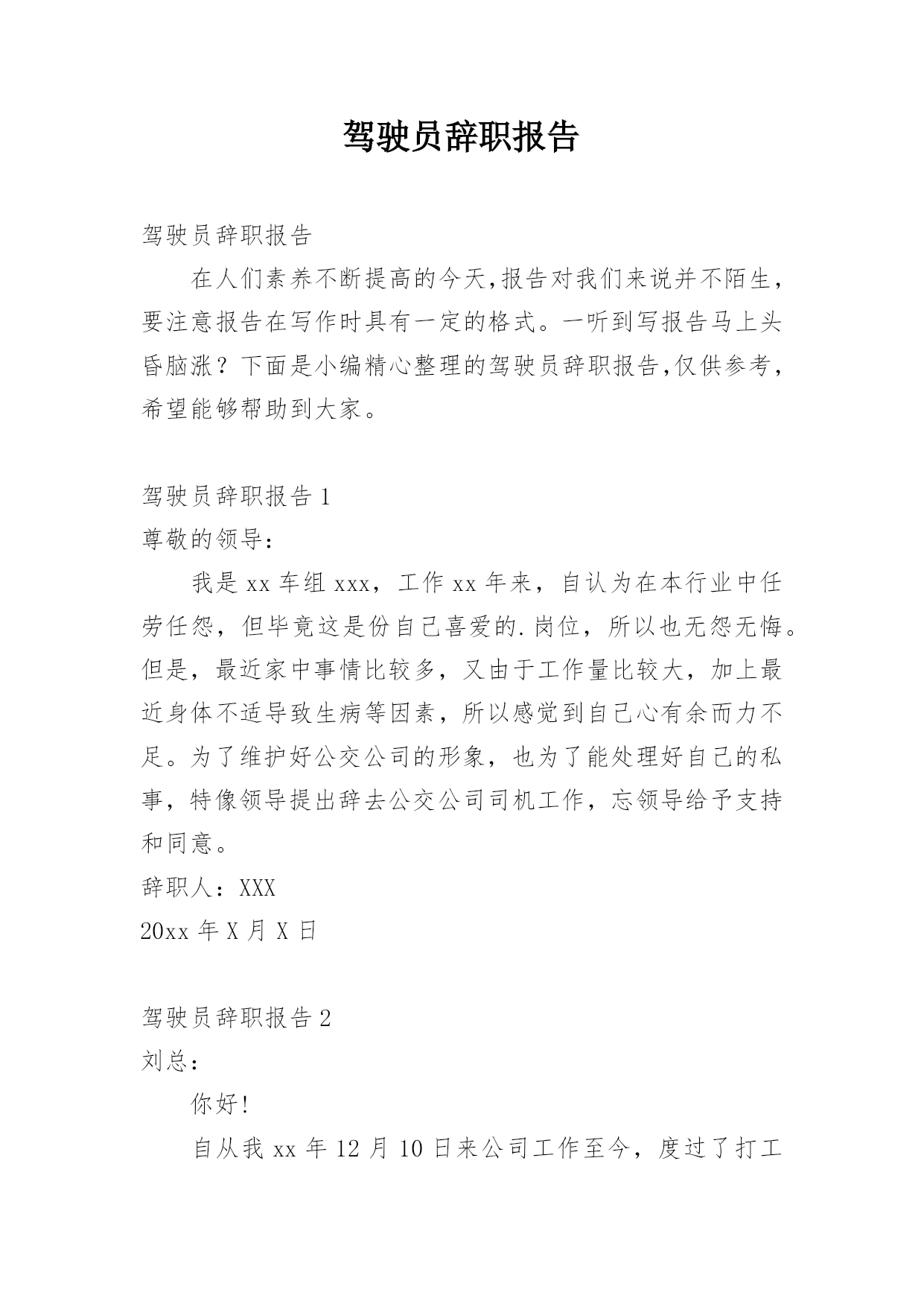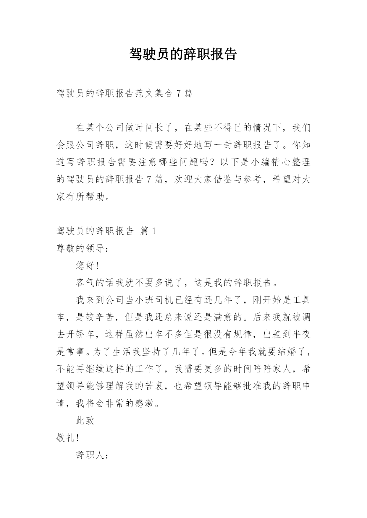驾驶员的辞职报告驾驶员的辞职报告范文集合7篇在某个公司做时间长了,在某些不得已的情况下,我们会跟公司辞职,这时候需要好好地写一封辞职报告了。你知道写辞职报告需要注意哪些问题吗?以下是小编精心整理的驾驶员的辞职报告7篇,欢迎大家借鉴与参考,希望对大家有所帮助。驾驶员的辞职报告篇1尊敬的领导:您好!客气的话我就不要多说了,这是我的辞职报告。我来到公司当小班司机已经有还几年了,刚开始是工具车,是较辛苦,但是我还总来说还是满意的。后来我就被调去开轿车,这样虽然出车不多但是很没有规律,出差到半夜是常事。为了生活我坚