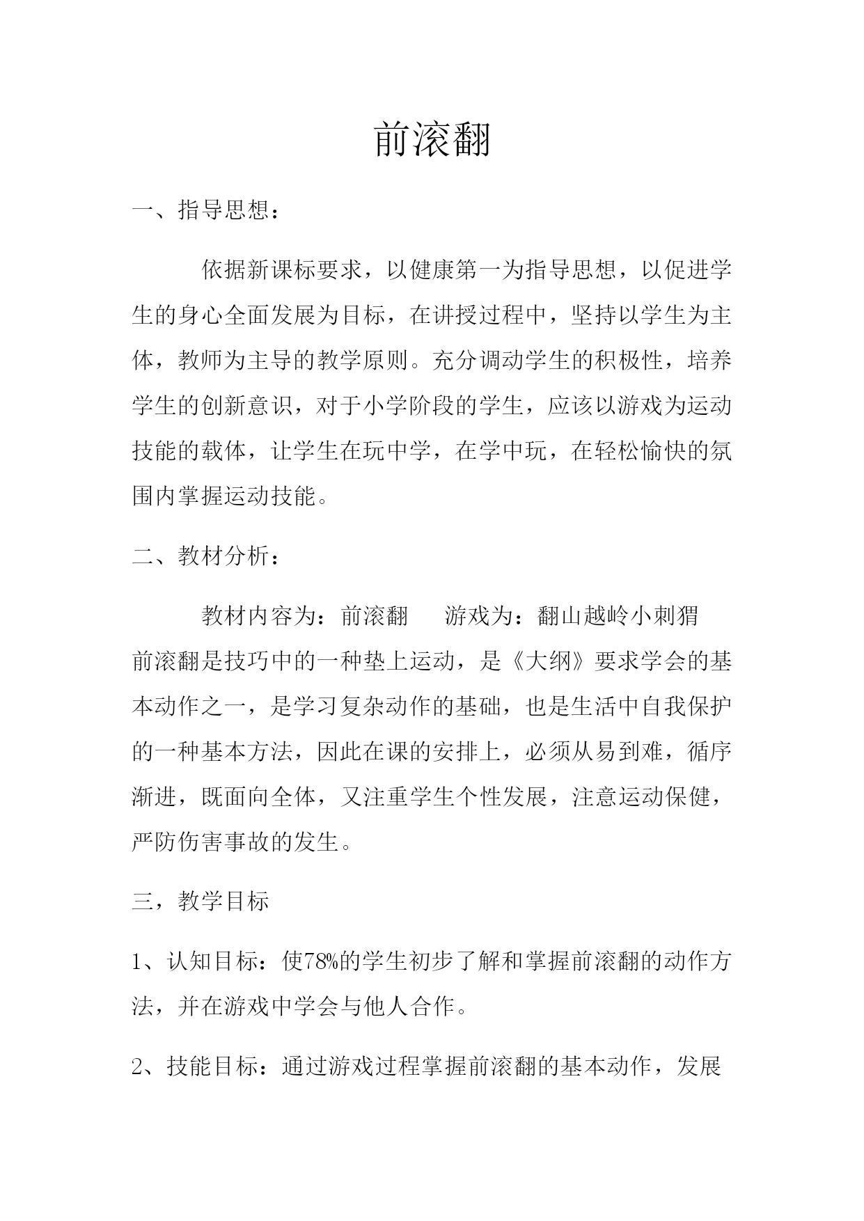 前滚翻一、指导思想:依据新课标要求,以健康第一为指导思想,以促进学生的身心全面发展为目标,在讲授过程中,坚持以学生为主体,教师为主导的教学原则。充分调动学生的积极性,培养学生的创新意识,对于小学阶段的学生,应该以游戏为运动技能的载体,让学生在玩中学,在学中玩,在轻松愉快的氛围内掌握运动技能。二、教材分析:教材内容为:前滚翻游戏为:翻山越岭小刺猬前滚翻是技巧中的一种垫上运动,是《大纲》要求学会的基本动作之一,是学习复杂动作的基础,也是生活中自我保护的一种基本方法,因此在课的安排上,必须从易到难,循序渐进,既