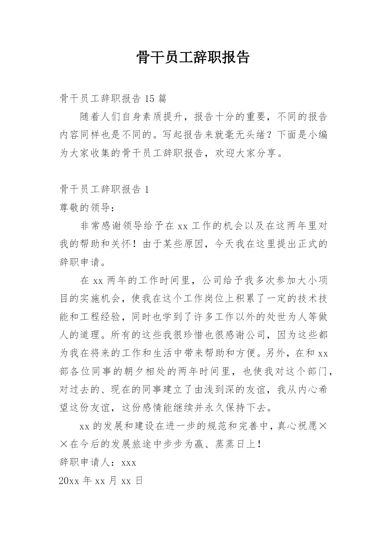 骨干员工辞职报告骨干员工辞职报告在人们素养不断提高的今天,我们都不可避免地要接触到报告,不同的报告内容同样也是不同的。一听到写报告就拖延症懒癌齐复发?以下是小编收集整理的骨干员工辞职报告,供大家参考借鉴,希望可以帮助到有需要的朋友。骨干员工辞职报告1尊敬的公司领导:非常感谢领导给予在工作的机会以及在这两年里对我的帮助和关怀!由于某些原因,今天我在这里提出正式的辞职报告。在两年的工作时间里,公司给予我多次参加大小项目的实施机会,使我在这个工作岗位上积累了一定的技术技能和工程经验,同时也学到了许多工作以外的处