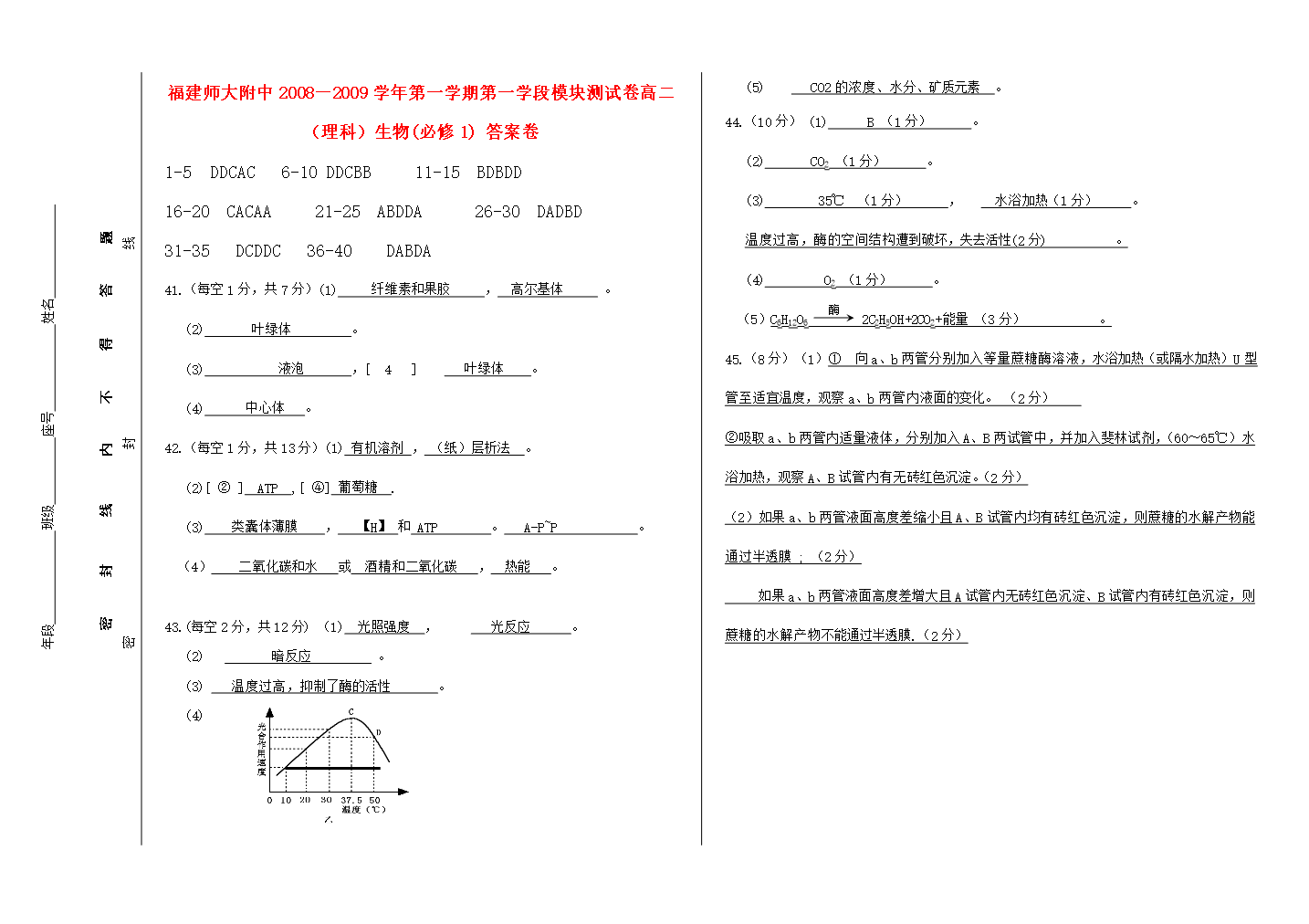 年段班级座号姓名密封线内不得答题封线内不得答题密封线封线福建师大附中2008-2009学年第一学期第一学段模块测试卷高二(理科)生物(必修1)答案卷DDCAC6-10DDCBB11-15BDBDD16-20CACAA21-25ABDDA26-30DADBD31-35DCDDC36-40DABDA41.(每空1分,共7分)(1)纤维素和果胶,高尔基体。(2)叶绿体。(3)液泡,[4]叶绿体。(4)中心体。42.(每空1分,共13分)(1)有机溶剂,(纸)层析法。(2)[=2\*GB3②]