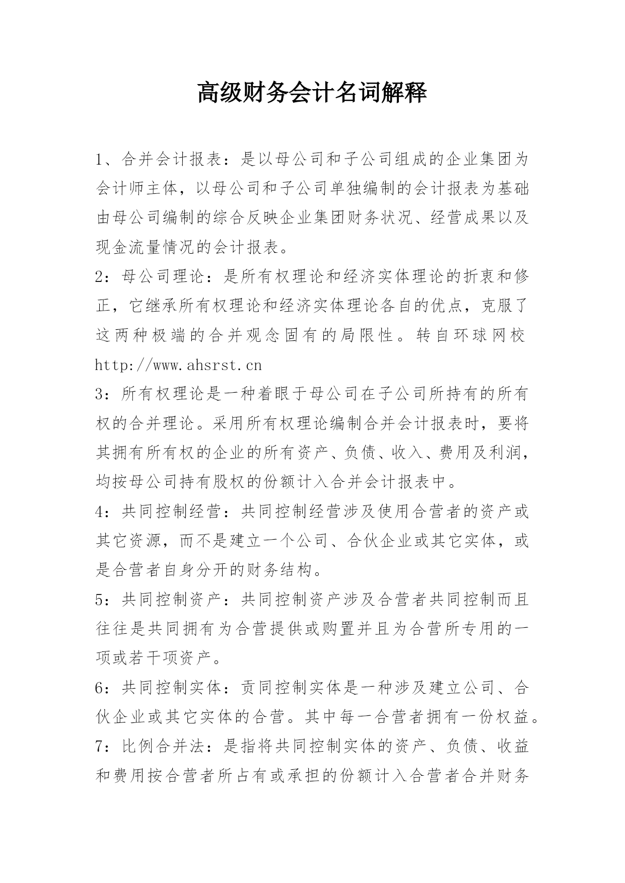 高级财务会计名词解释高级财务会计名词解释1、合并会计报表:是以母公司和子公司组成的企业集团为会计师主体,以母公司和子公司单独编制的会计报表为基础由母公司编制的综合反映企业集团财务状况、经营成果以及现金流量情况的会计报表。2:母公司理论:是所有权理论和经济实体理论的折衷和修正,它继承所有权理论和经济实体理论各自的优点,克服了这两种极端的合并观念固有的局限性。转自环球网校http://3:所有权理论是一种着眼于母公司在子公司所持有的所有权的合并理论。采用所有权理论编制合并会计报表时,要将其拥有所有权的企业的所