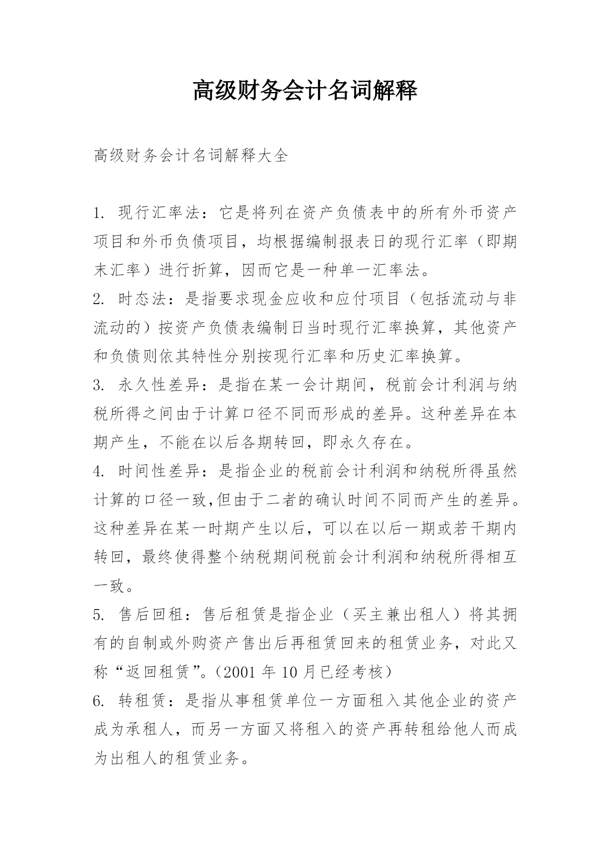 高级财务会计名词解释高级财务会计名词解释大全1.现行汇率法:它是将列在资产负债表中的所有外币资产项目和外币负债项目,均根据编制报表日的现行汇率(即期末汇率)进行折算,因而它是一种单一汇率法。2.时态法:是指要求现金应收和应付项目(包括流动与非流动的)按资产负债表编制日当时现行汇率换算,其他资产和负债则依其特性分别按现行汇率和历史汇率换算。3.永久性差异:是指在某一会计期间,税前会计利润与纳税所得之间由于计算口径不同而形成的差异。这种差异在本期产生,不能在以后各期转回,即永久存在。4.时间性差异:是指企业的