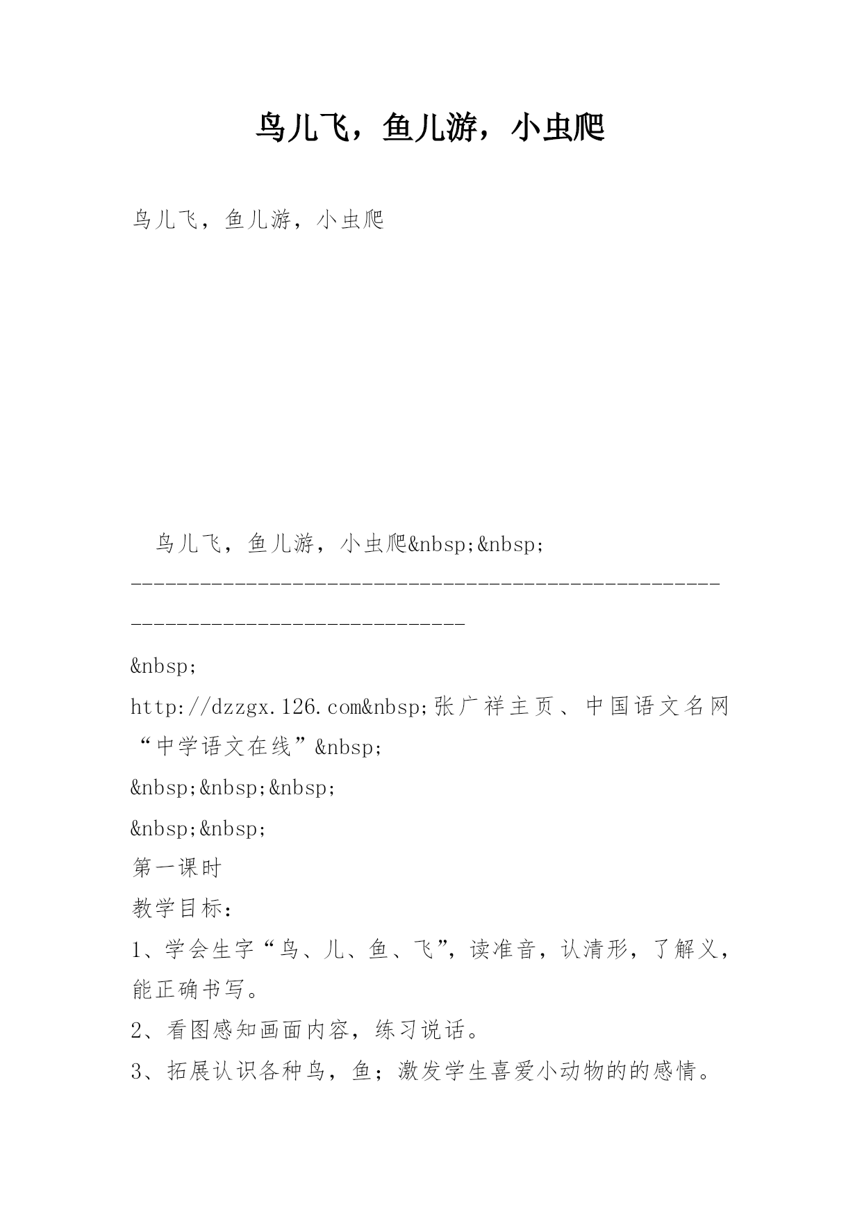 鸟儿飞,鱼儿游,小虫爬鸟儿飞,鱼儿游,小虫爬鸟儿飞,鱼儿游,小虫爬 -------------------------------------------------------------------------------- http://dzzgx.126.com 张广祥主页、中国语文名网“中学语文在线” 第一课时教学目标:1、学会生字“鸟、儿、鱼、飞”,读准音,认清形,了解义,能正确书写